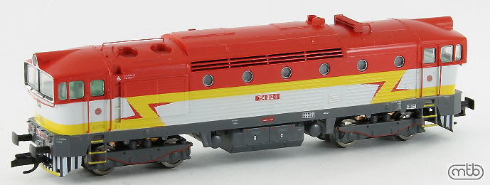 Popis   dieselová lokomotiva červená-bílá se žlutými blesky