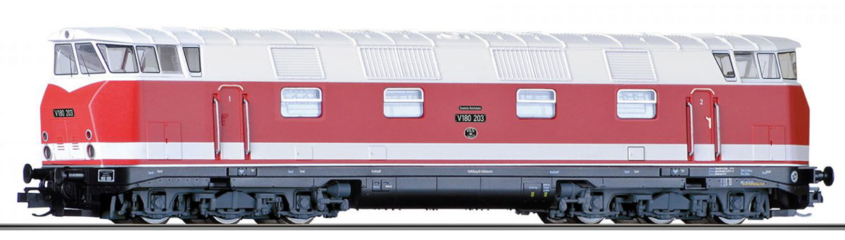 Popis   dieselová lokomotiva červená-slonová kost, černý rám a pojezd