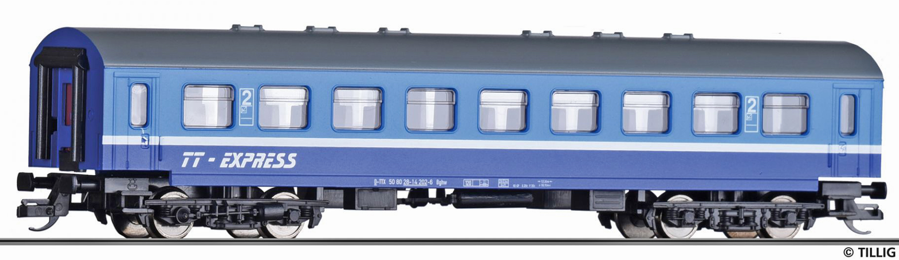 | osobní vůz v odstínech modré s šedou střechou 2. tř. „TT-Express“ |