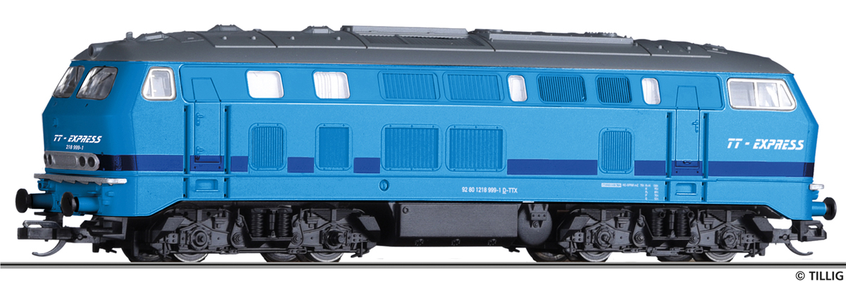 | dieselová lokomotiva v odstínech modré s šedou střechou „TT-Express“ |