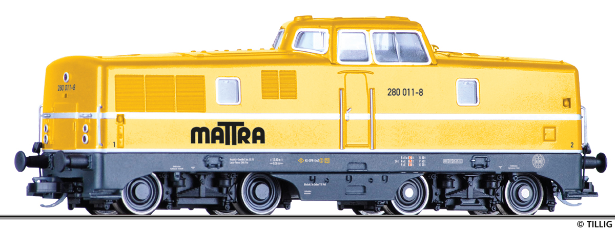| dieselová lokomotiva žlutá s černým rámem a pojezdem „MATTRA“ |