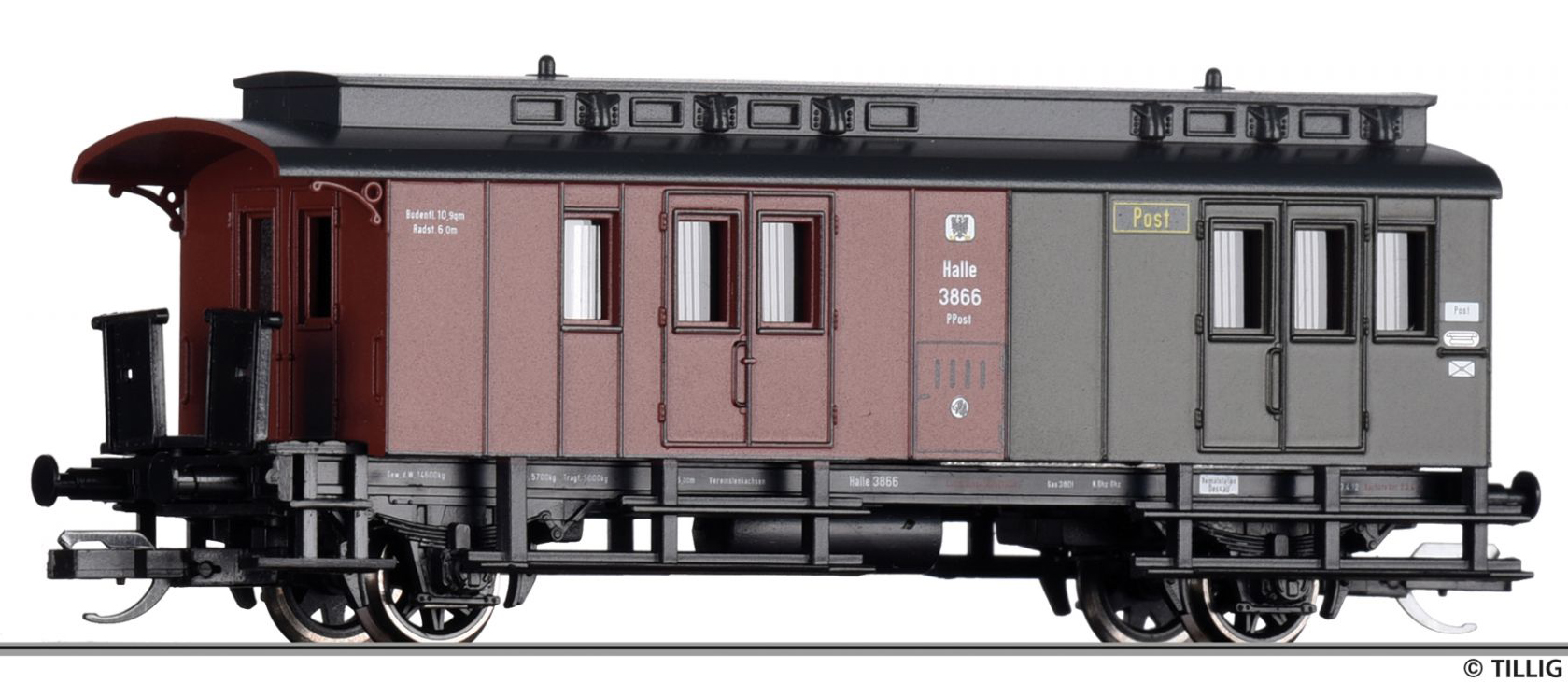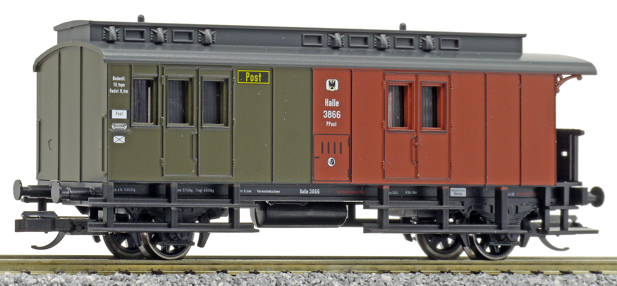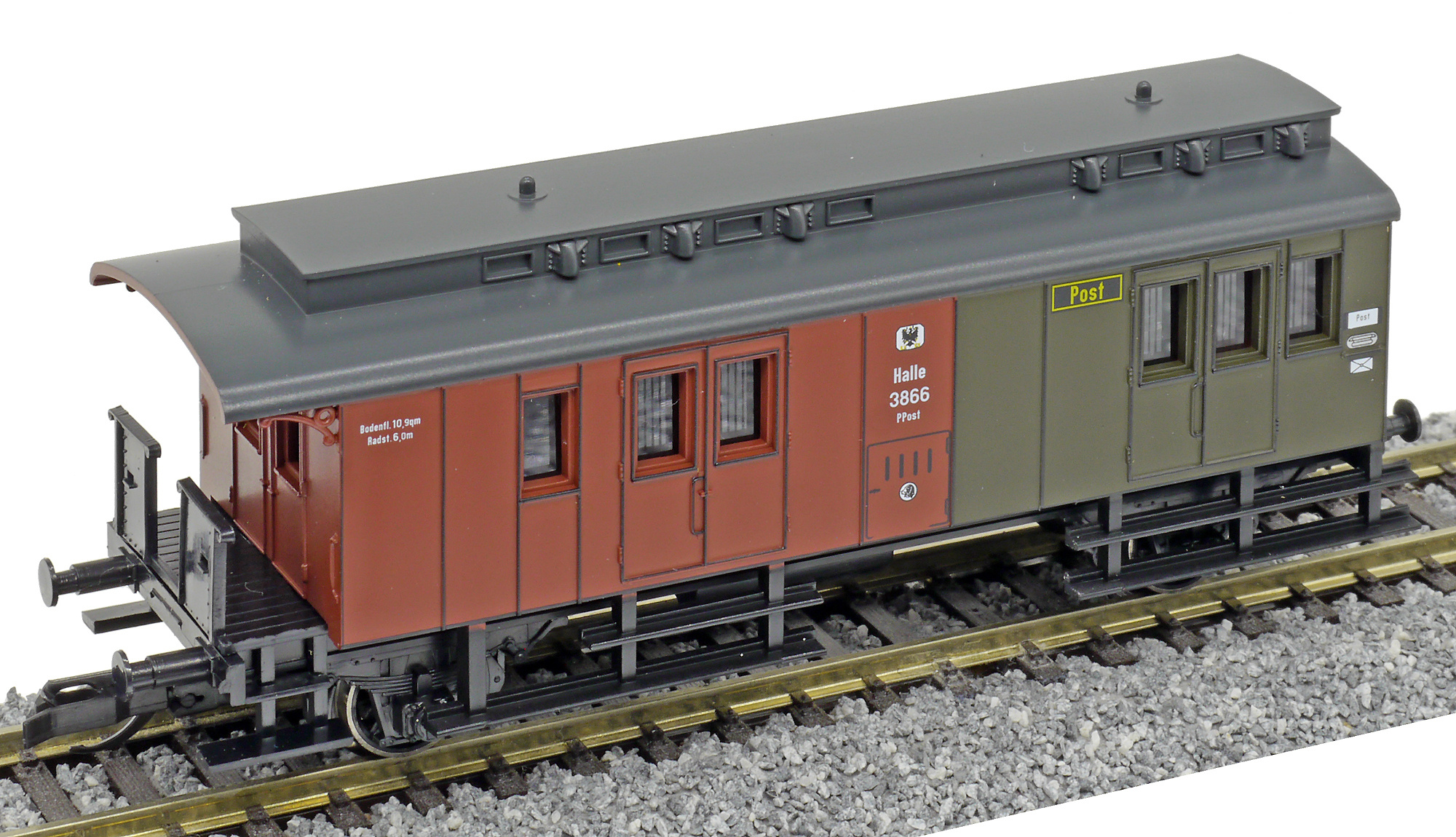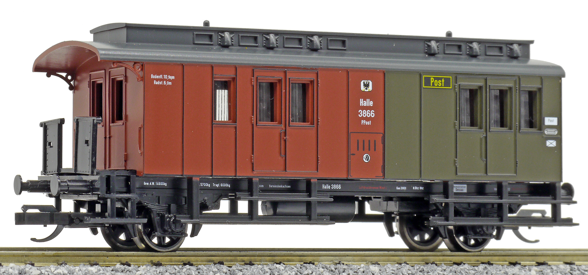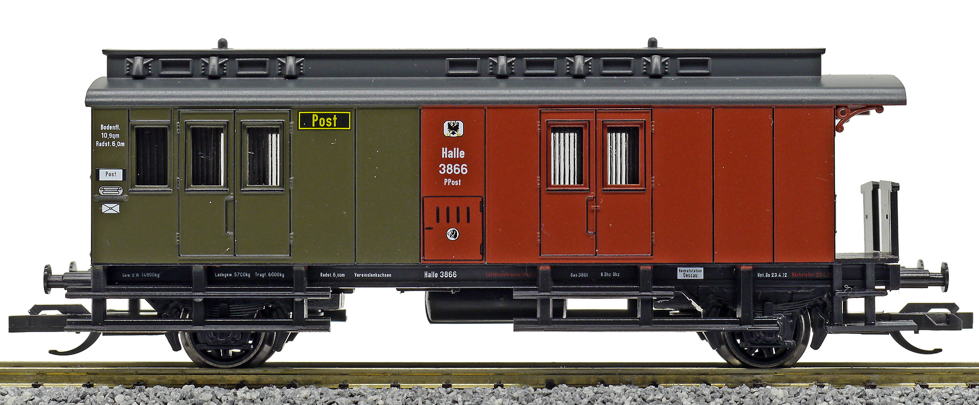 | zavazadlový vůz s poštovním oddílem červený-tmavě zelený s černou střechou |