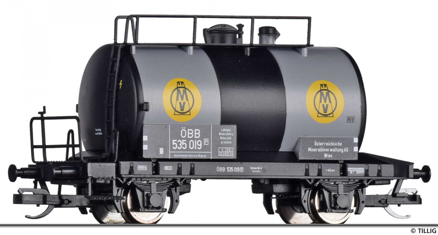 kotlový vůz tmavě šedý s černým pásem a s logy „ÖMV“