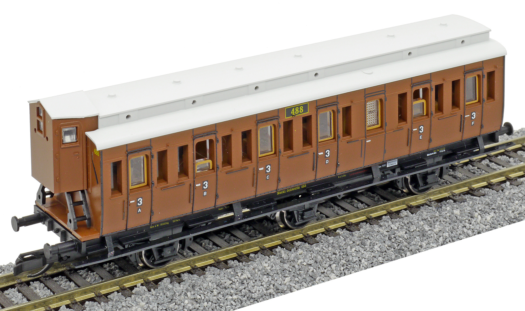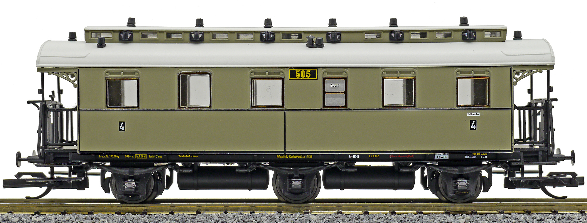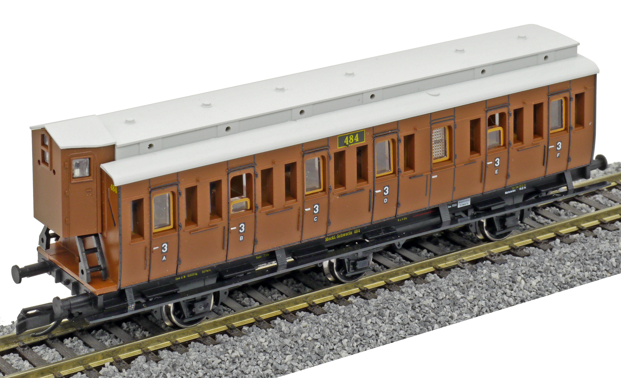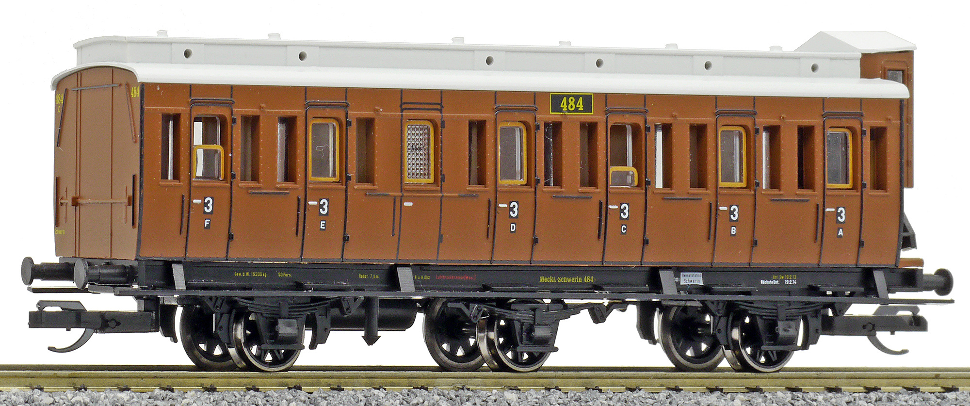 | oddílový osobní vůz červenohnědý se světle šedou střechou 3. tř. „Mecklenburgischer Reisezug 2“ |