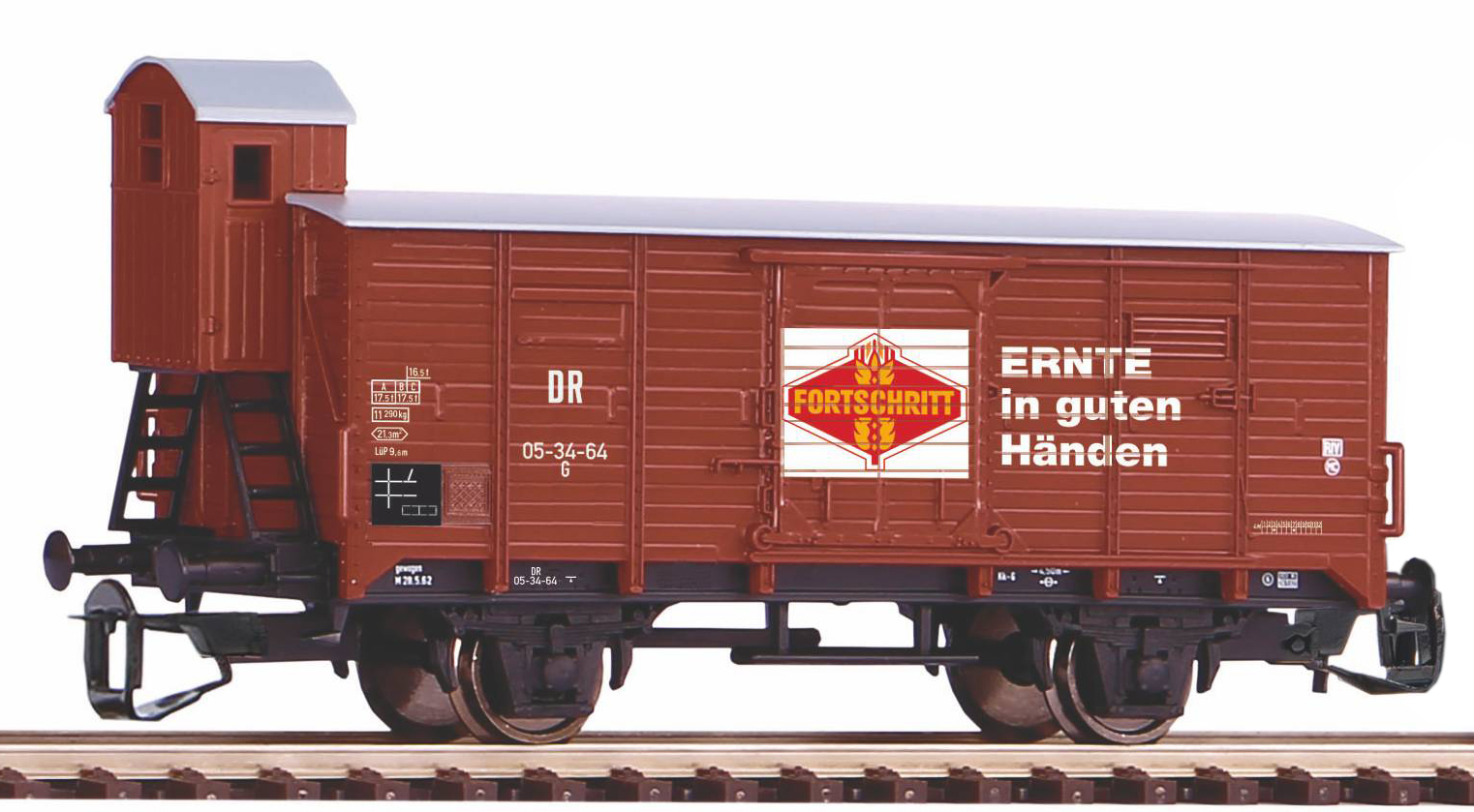 | krytý nákladní vůz červenohnědý s šedou střechou a s brzdařskou budkou „Fortschritt“ |