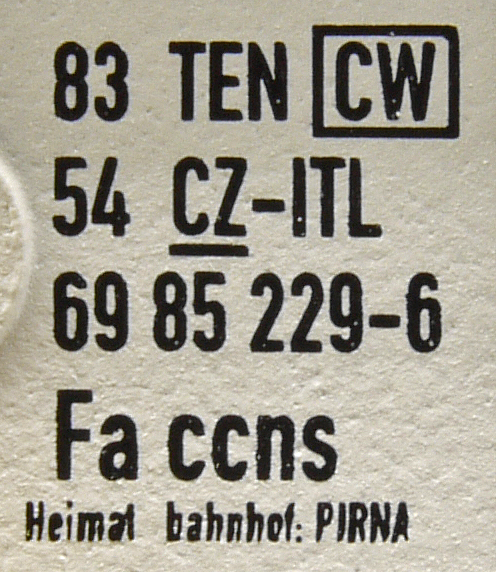 | • 83 54 69 85 229-6 | → | nákladní, s podvozky, soukromý vůz, pro mezinárodní dopravu dle zvláštních úmluv |