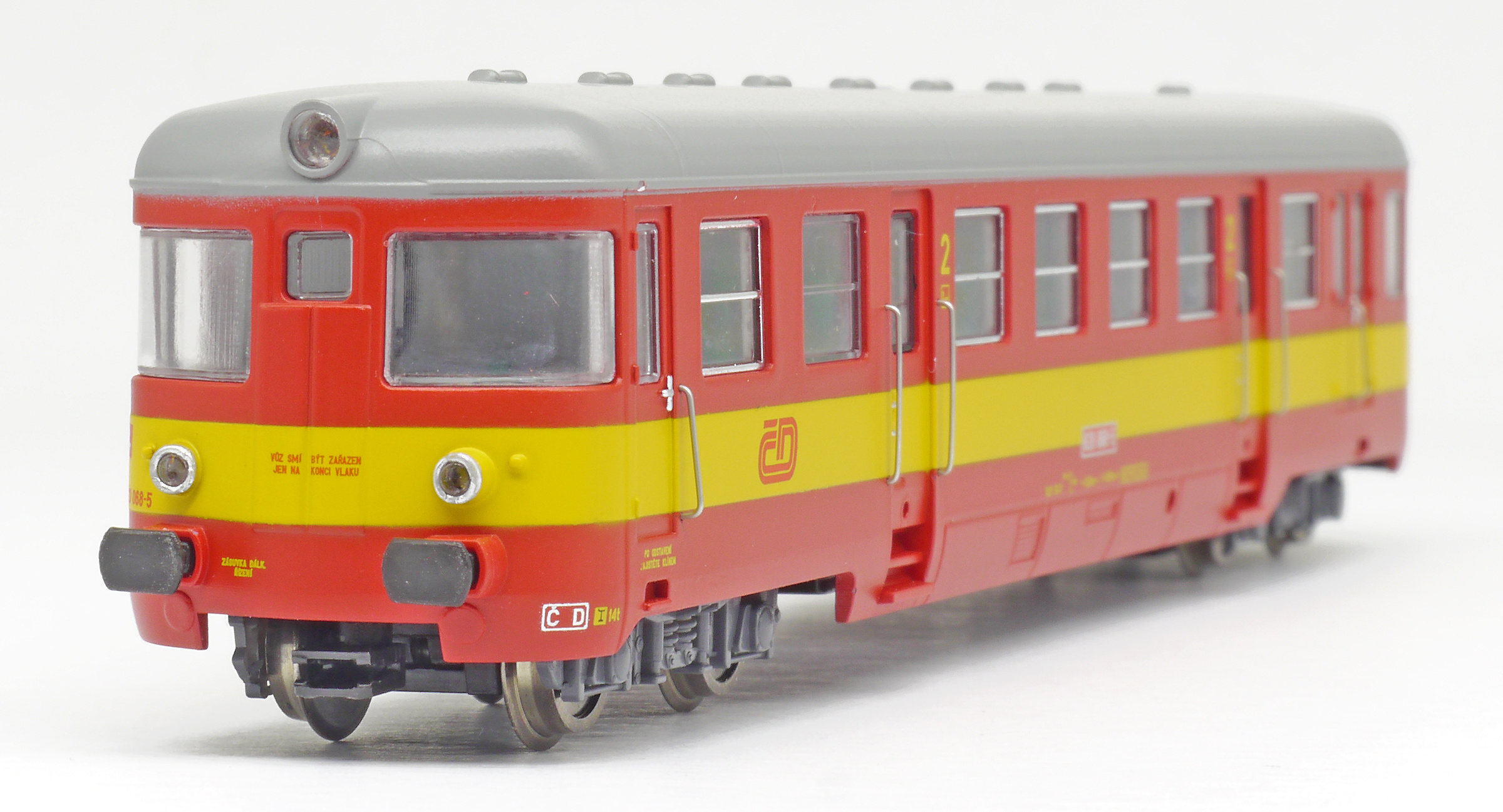 Popis   motorový vůz červený s výstražným pruhem a s šedou střechou