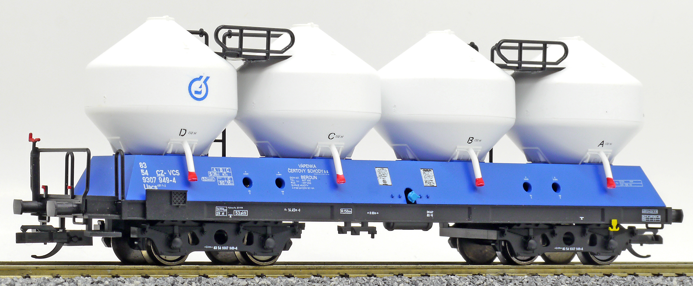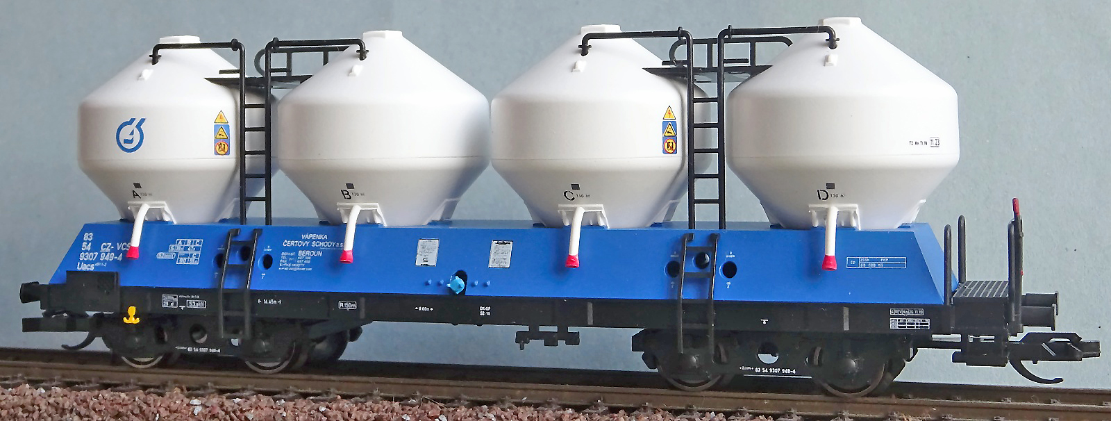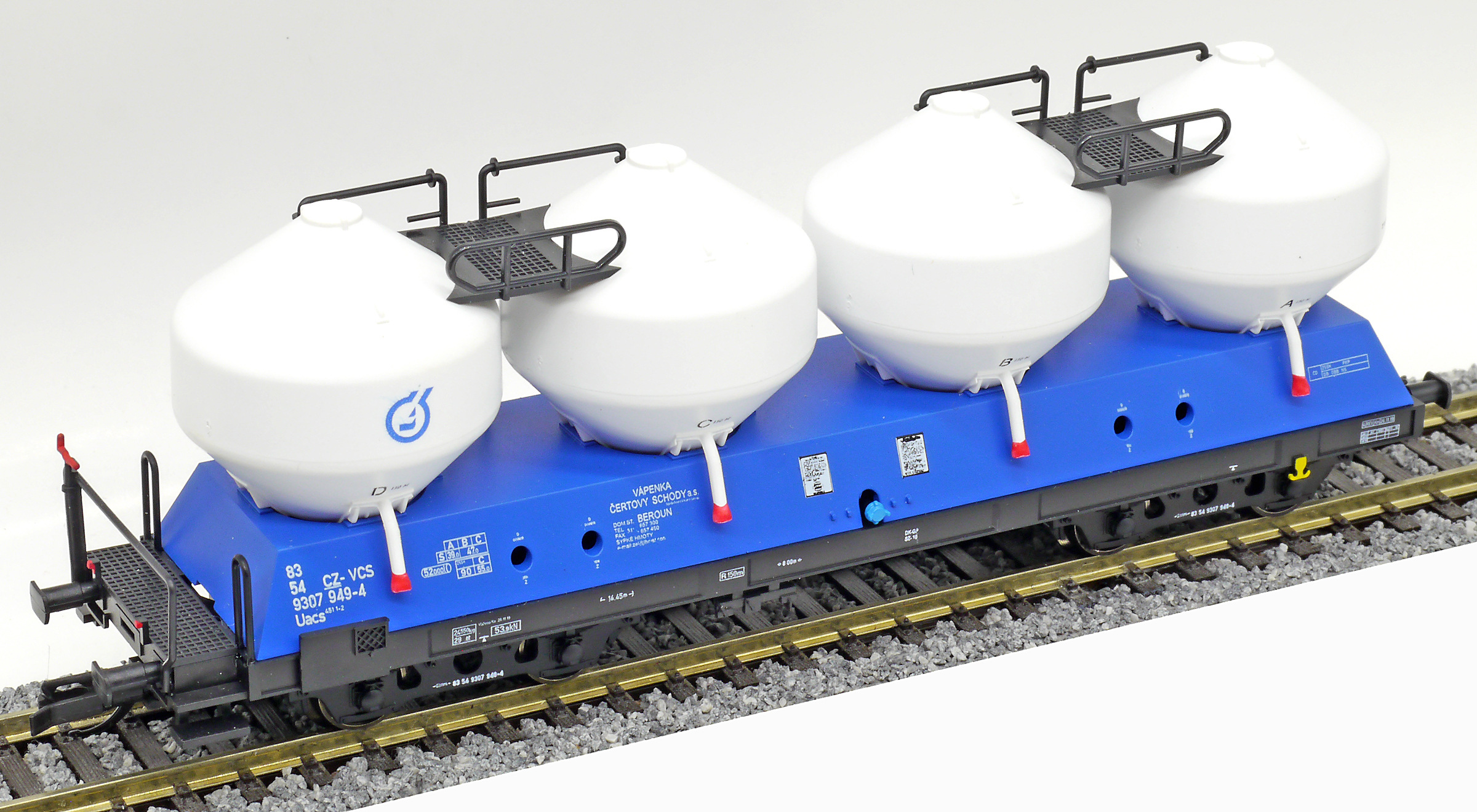 | nákladní samovýsypný vůz modrý s bílými nádobami „Vápenka Čertovy schody“ |