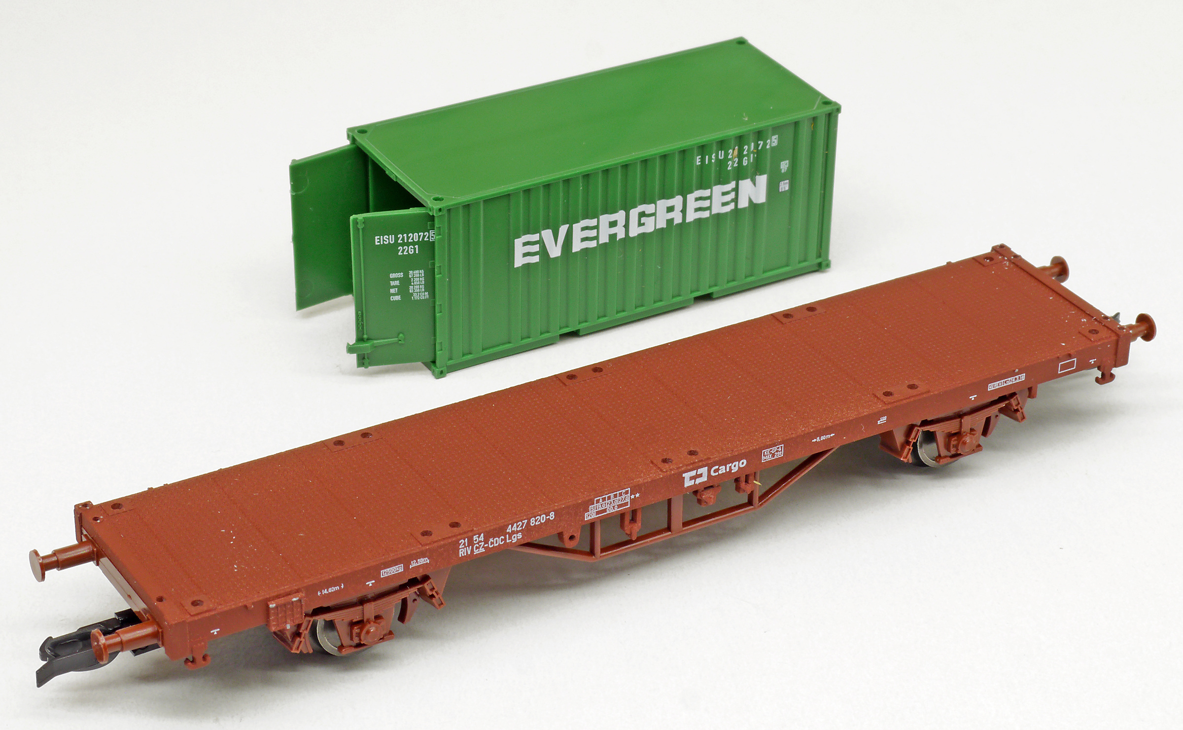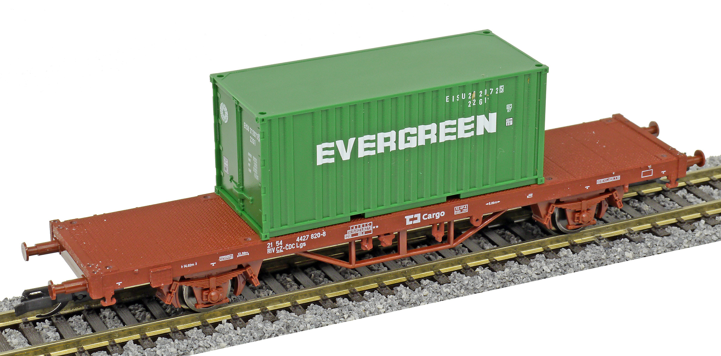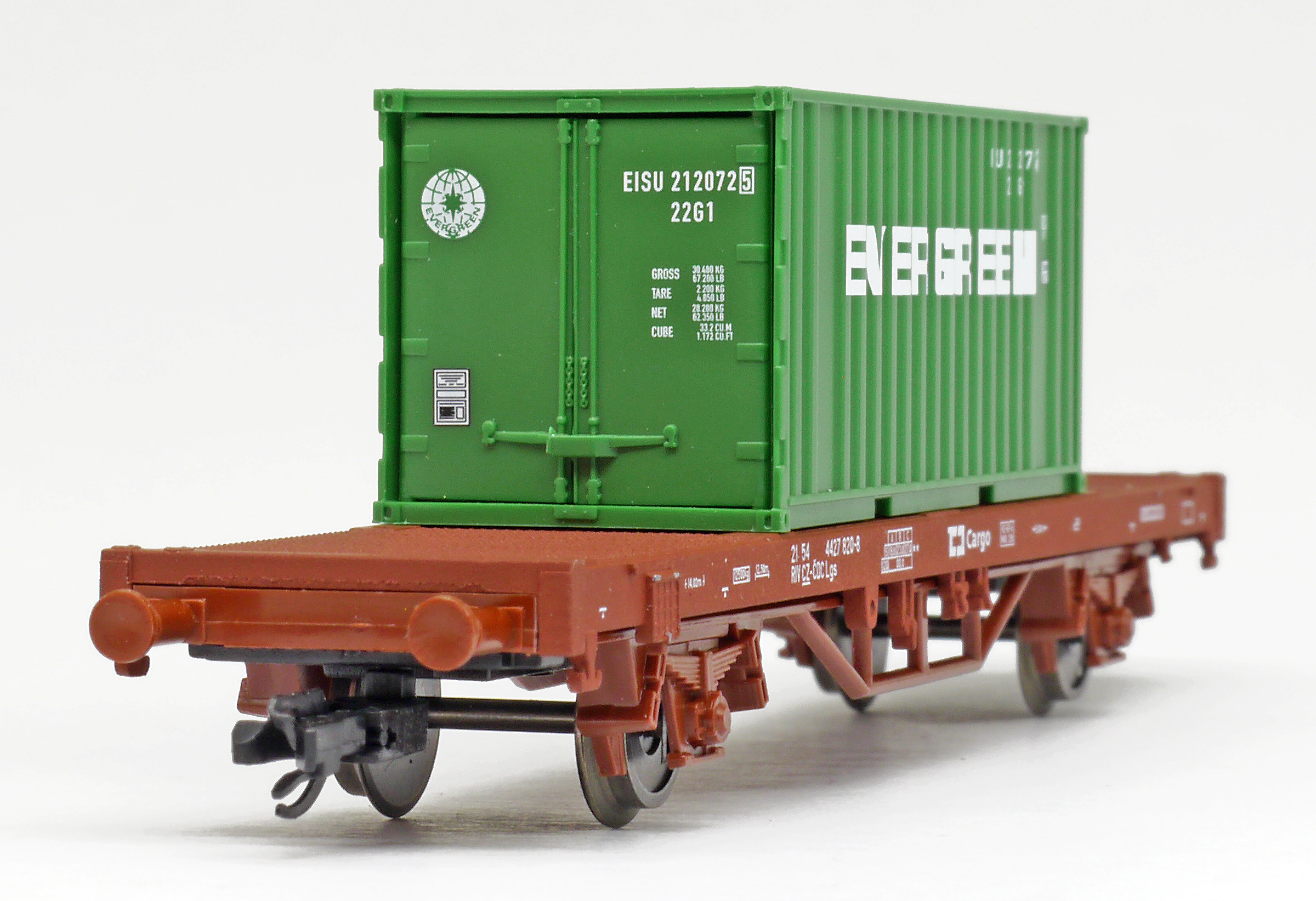 | plošinový vůz červenohnědý s nákladem 1x 20' kontejneru „EVERGREEN“ |