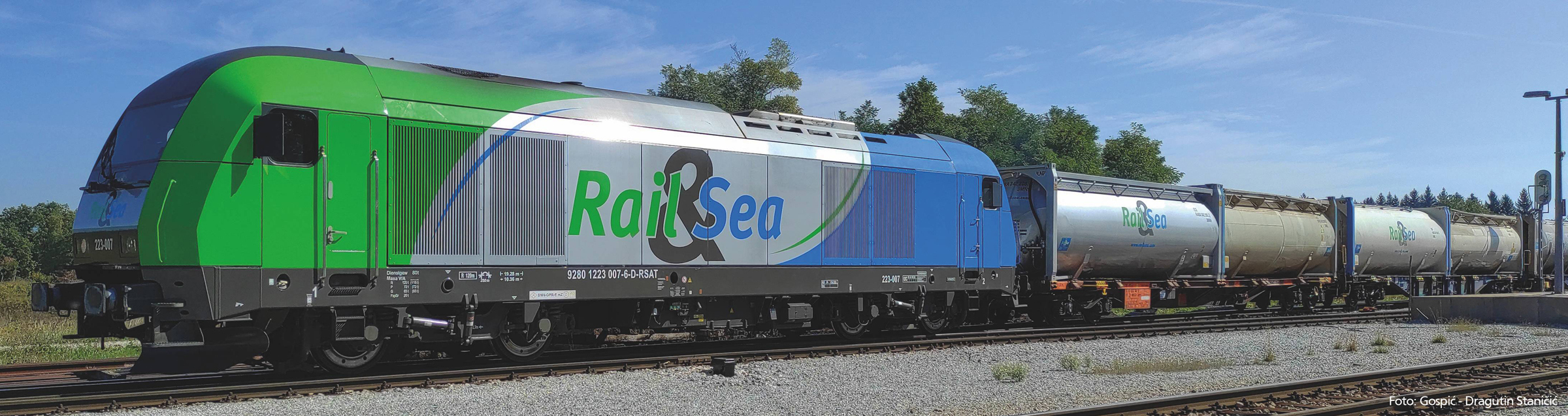 Popis   dieselová lokomotiva v modrém-zeleném barevném schematu „Rail & Sea“