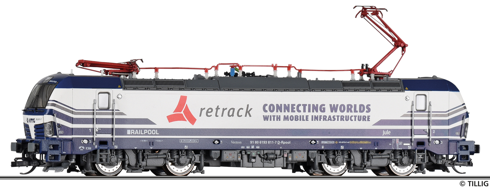 Popis   elektrická lokomotiva v potisku modrá-bílá „Retrack / VTG“