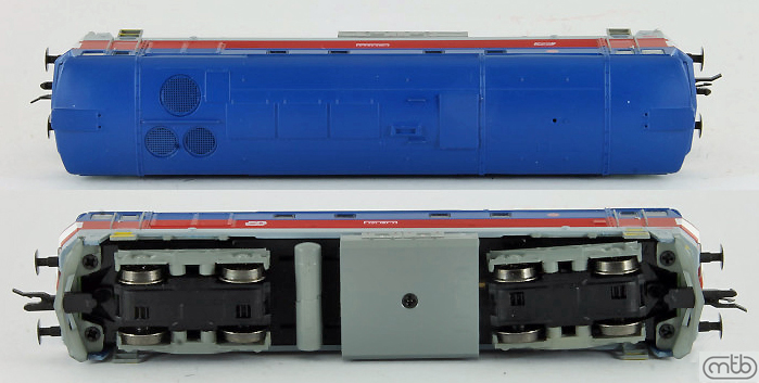 Popis   dieselová lokomotiva červená-modrá, tmavě šedý rám a pojezd, bílý pás na poprsí