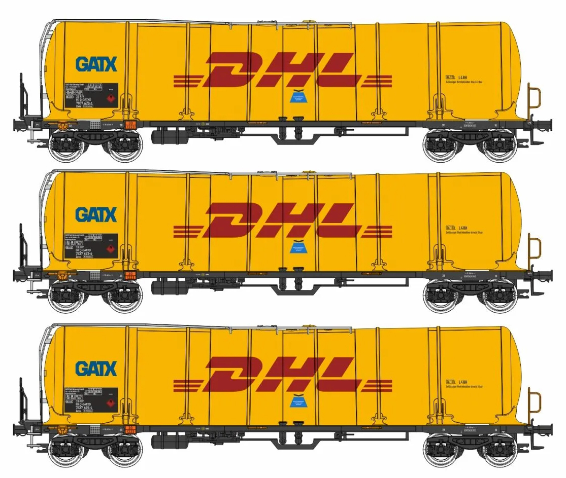 | set tří žlutých kotlových vozů s logem „DHL“ |