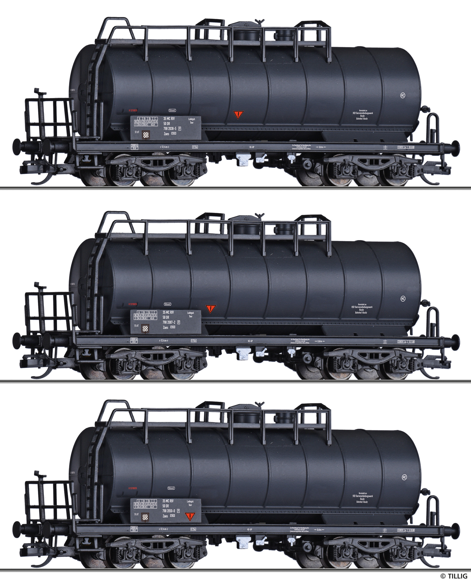 | set tří černých kotlových vozů „VEB Teerverarbeitungswerk Rositz“ |