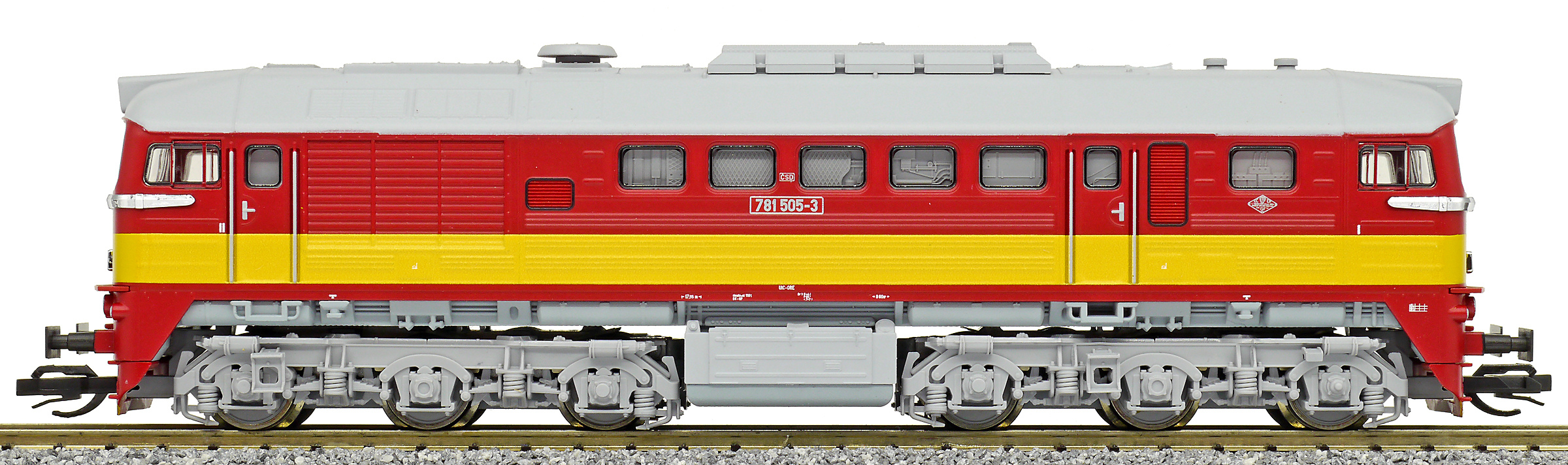 | dieselová lokomotiva červená se žlutým výstražným pruhem, šedá střecha a pojezd |