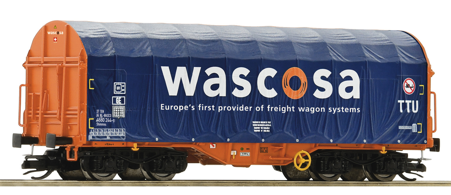 | plošinový vůz oranžový s odsuvnou modrou plachtou „Wascosa“ |