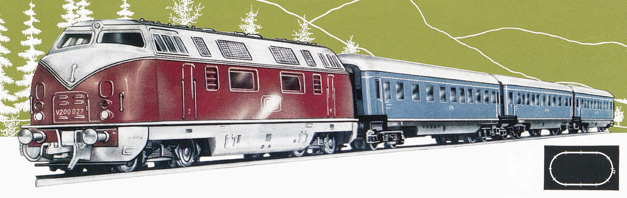 set dieselové lokomotivy V 200 a tří rychlíkových vozů