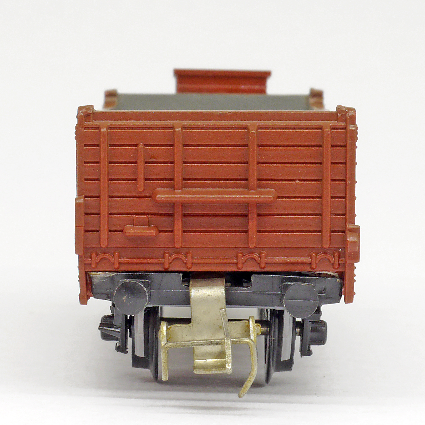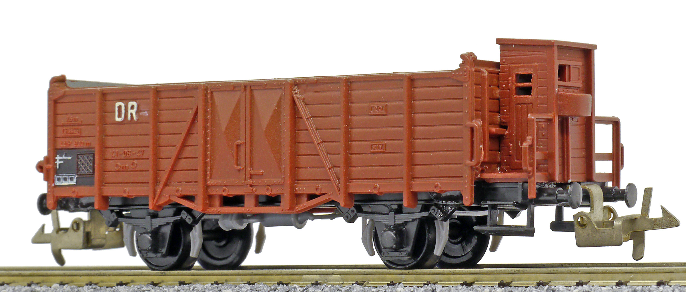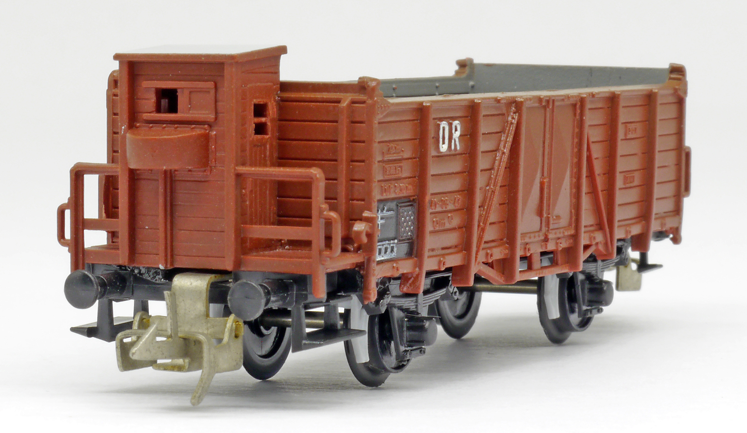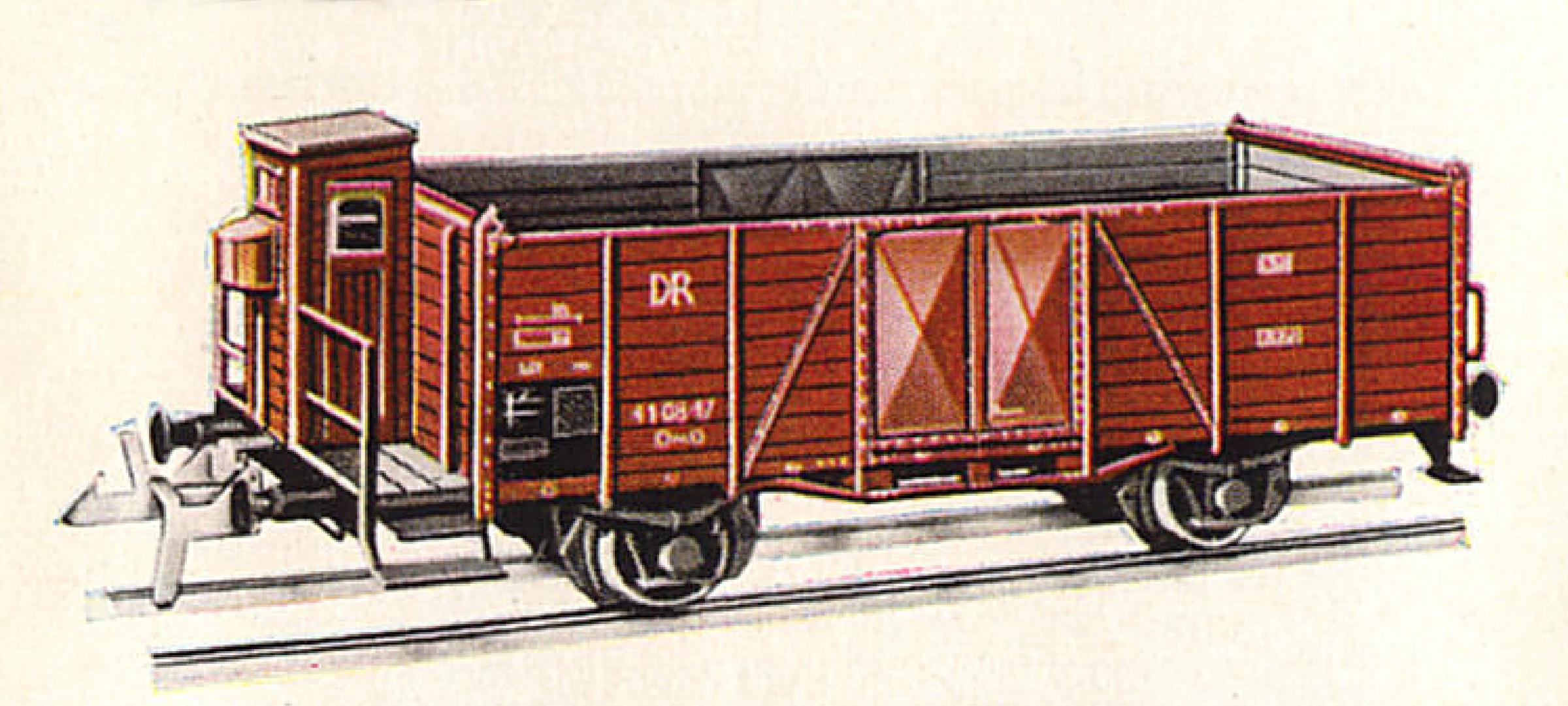 | otevřený nákladní vůz červenohnědý s brzdařskou budkou |