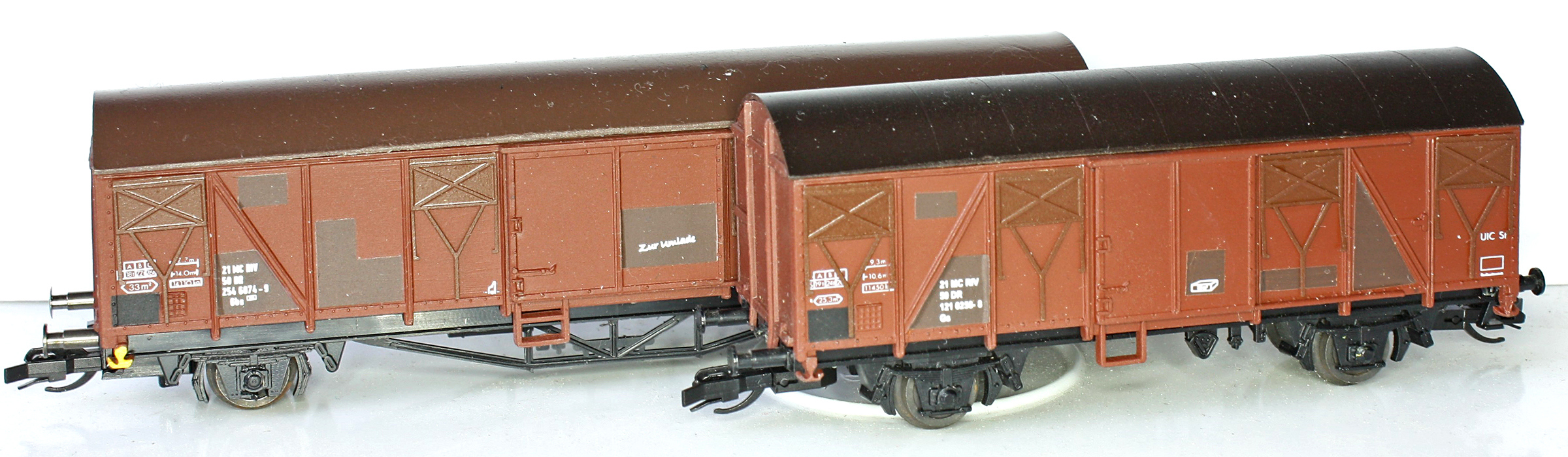 | set dvou nákladních krytých vozů s barevnými záplatami |