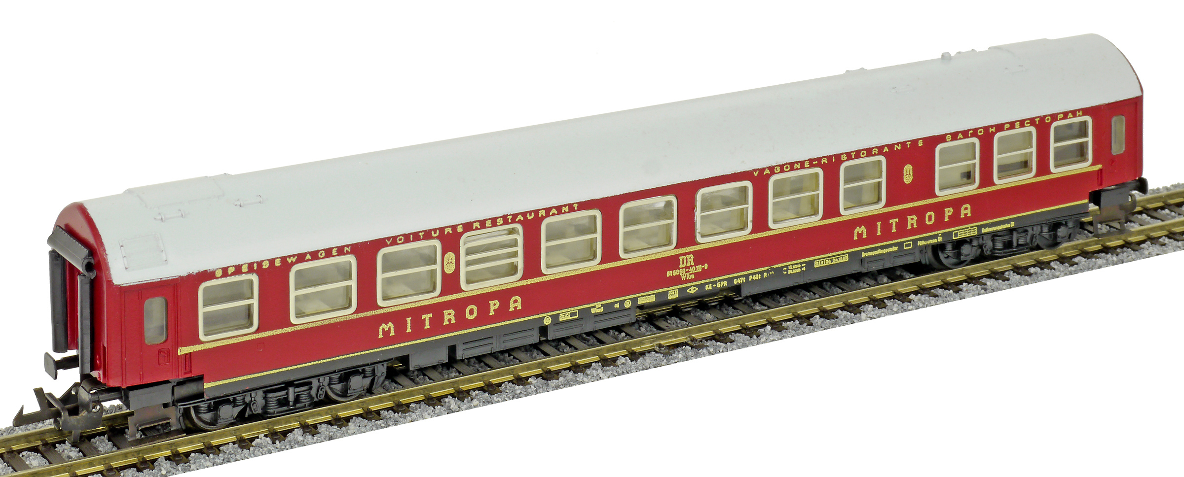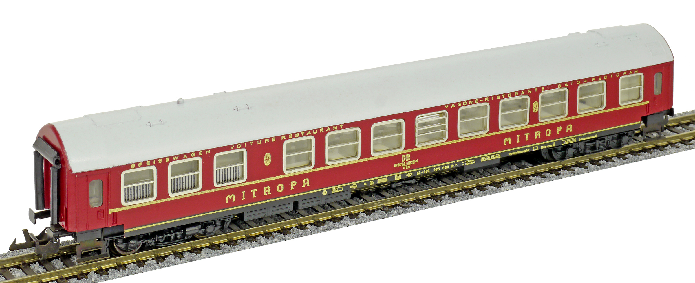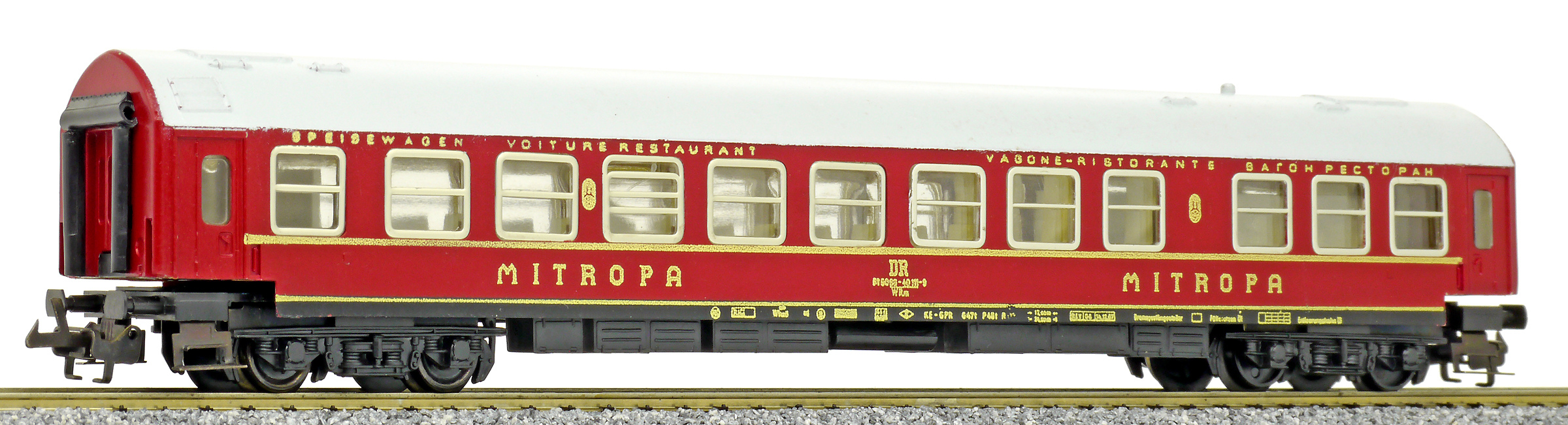 | jídelní vůz červený s šedou střechou jídelní „MITROPA“ |