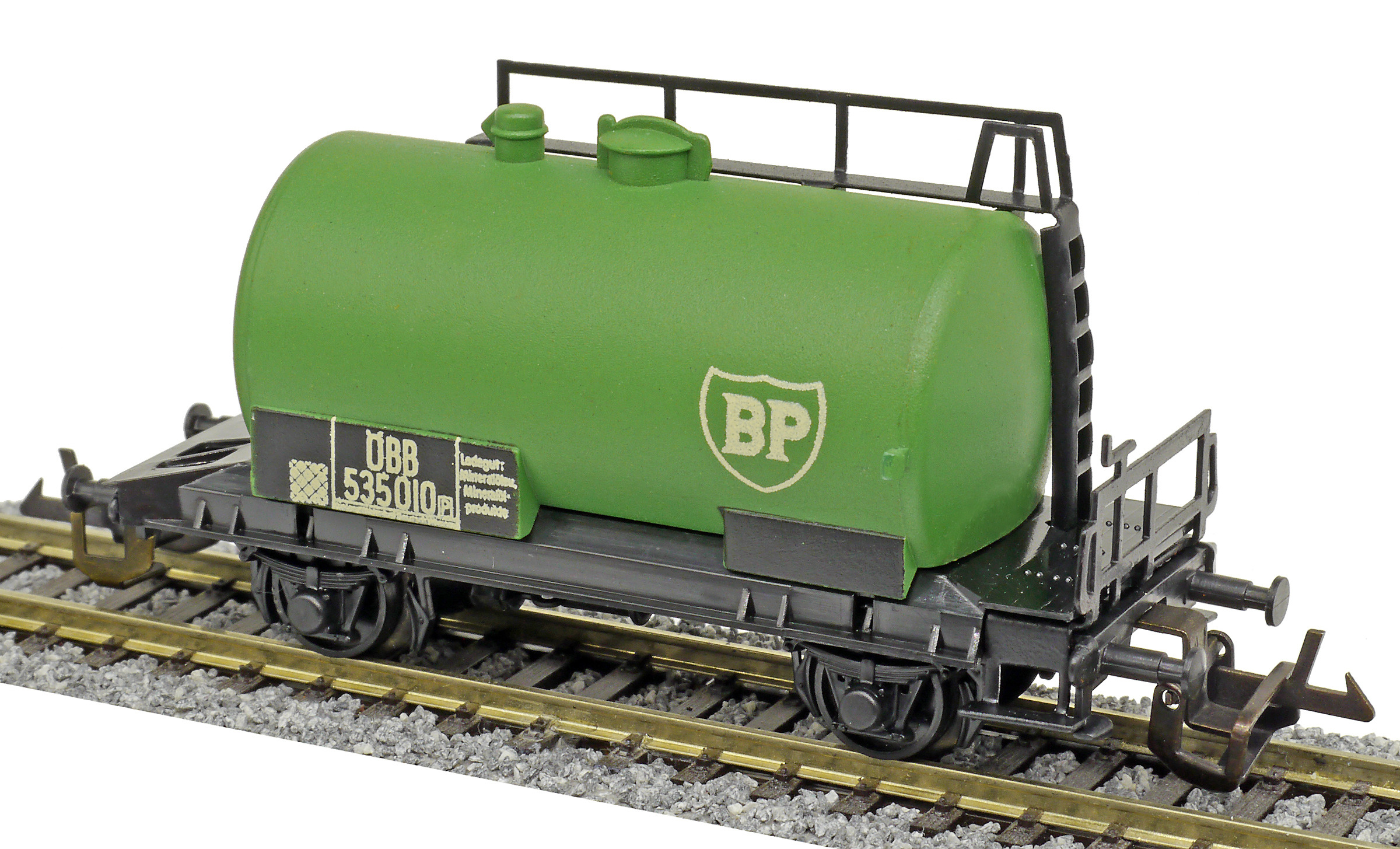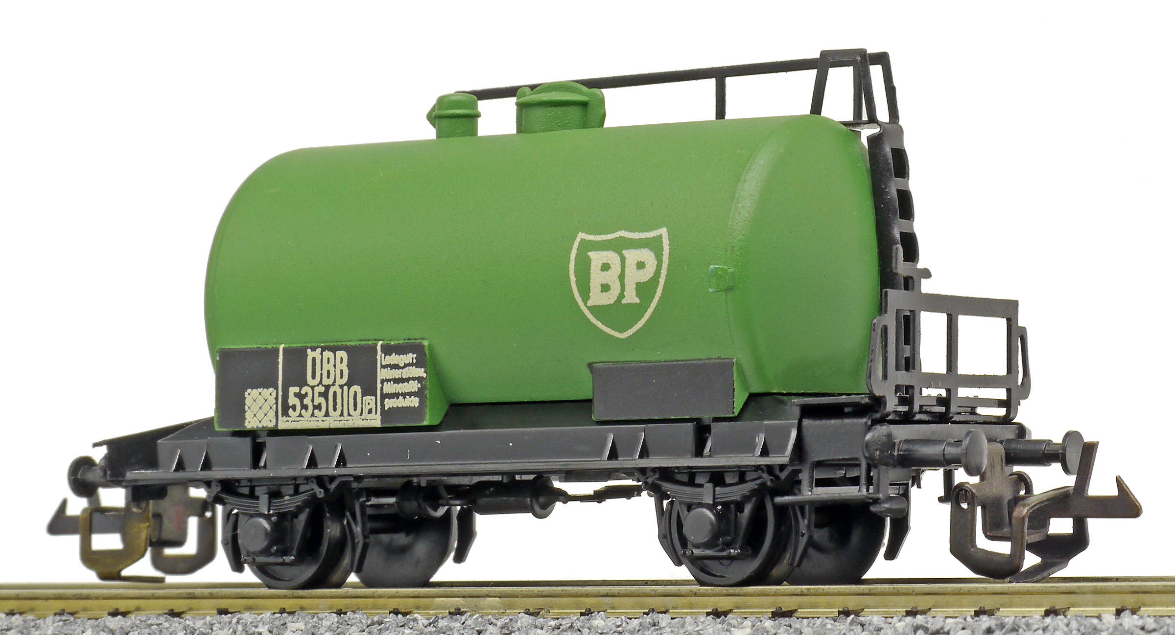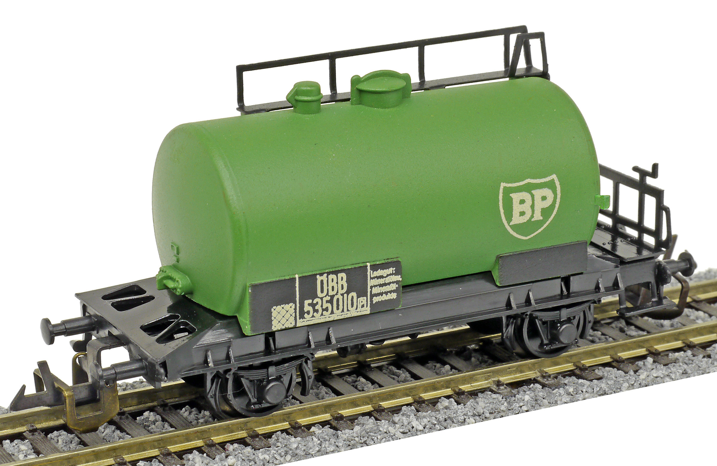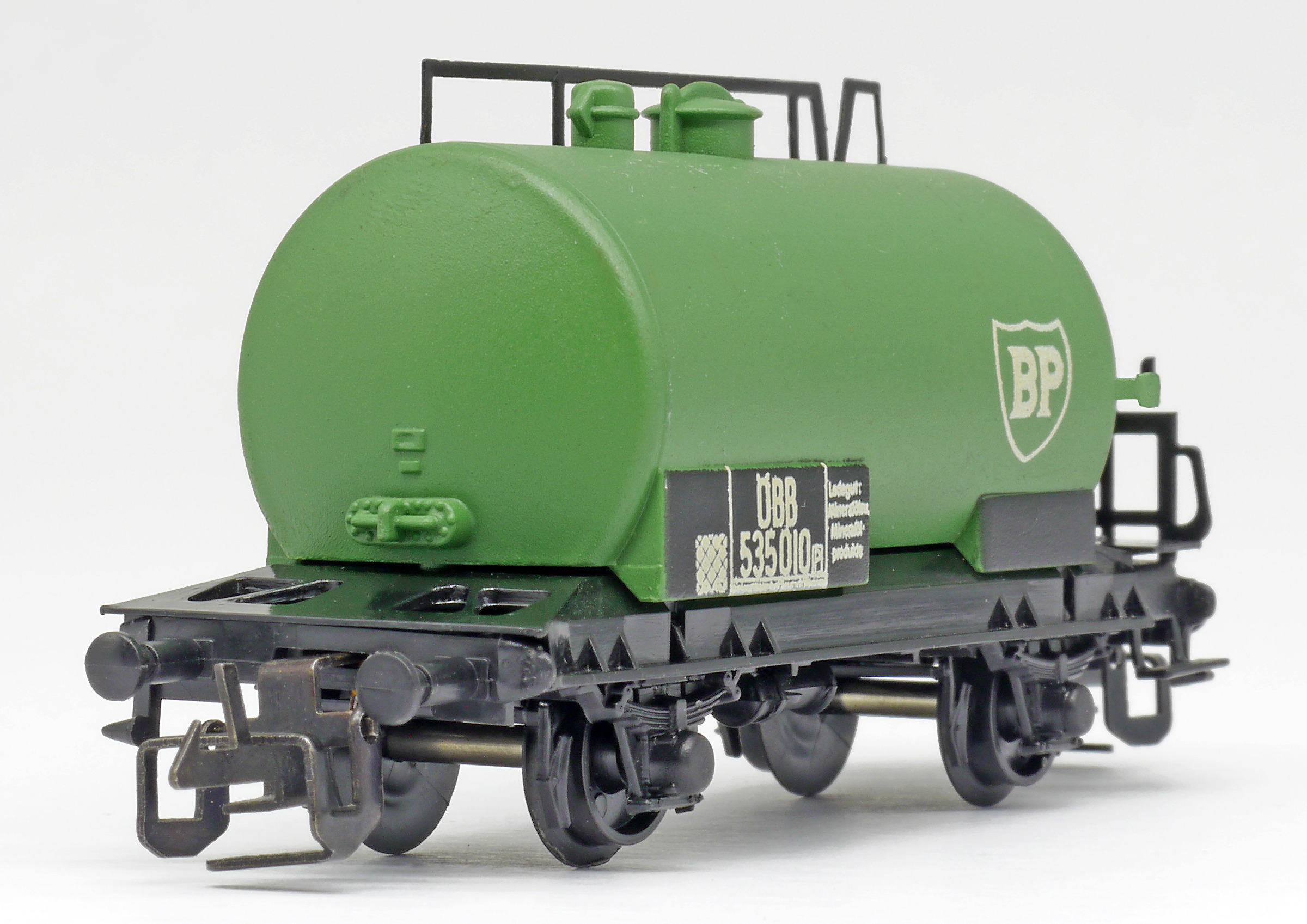 kotlový vůz zelený s černým pojezdem a s logem „BP“
