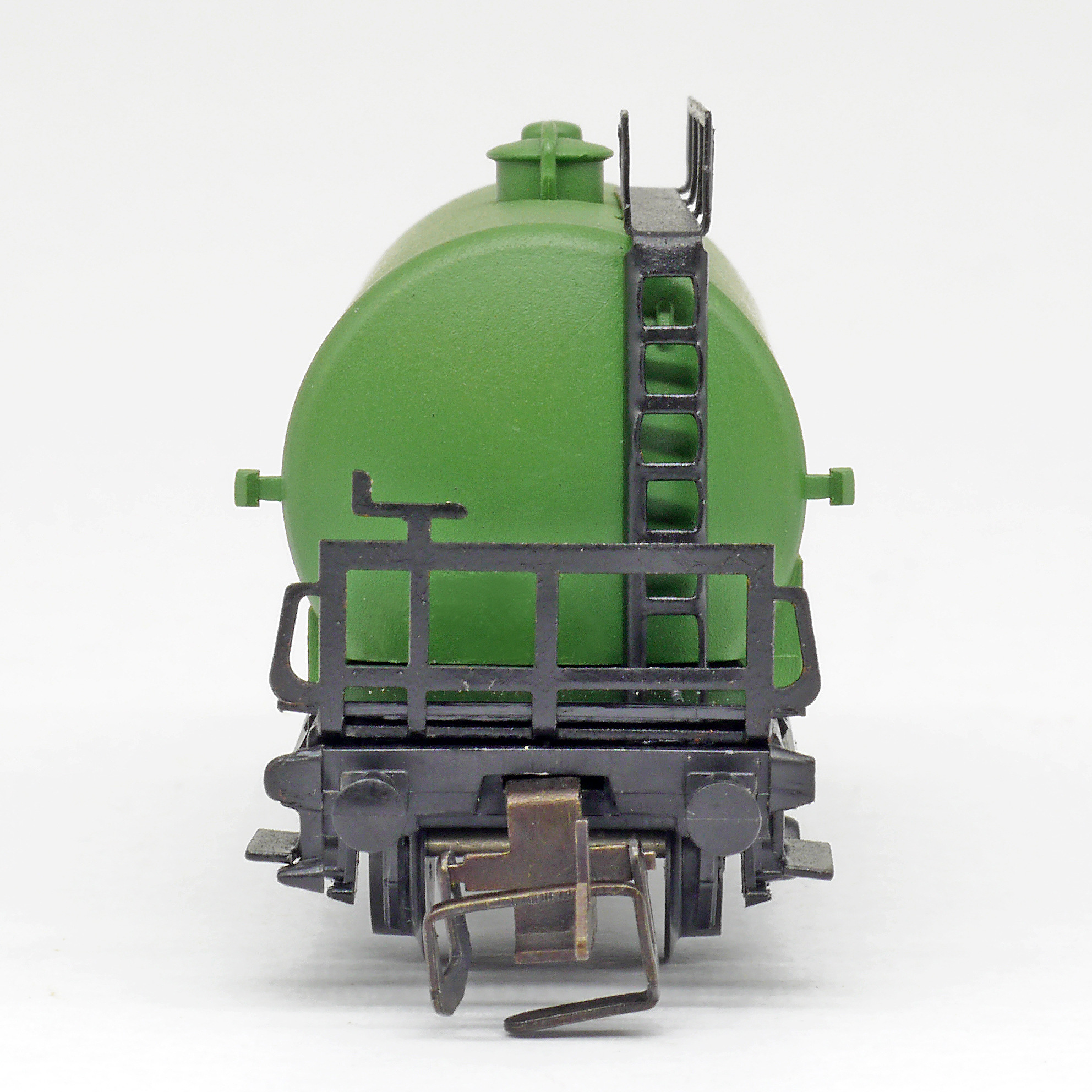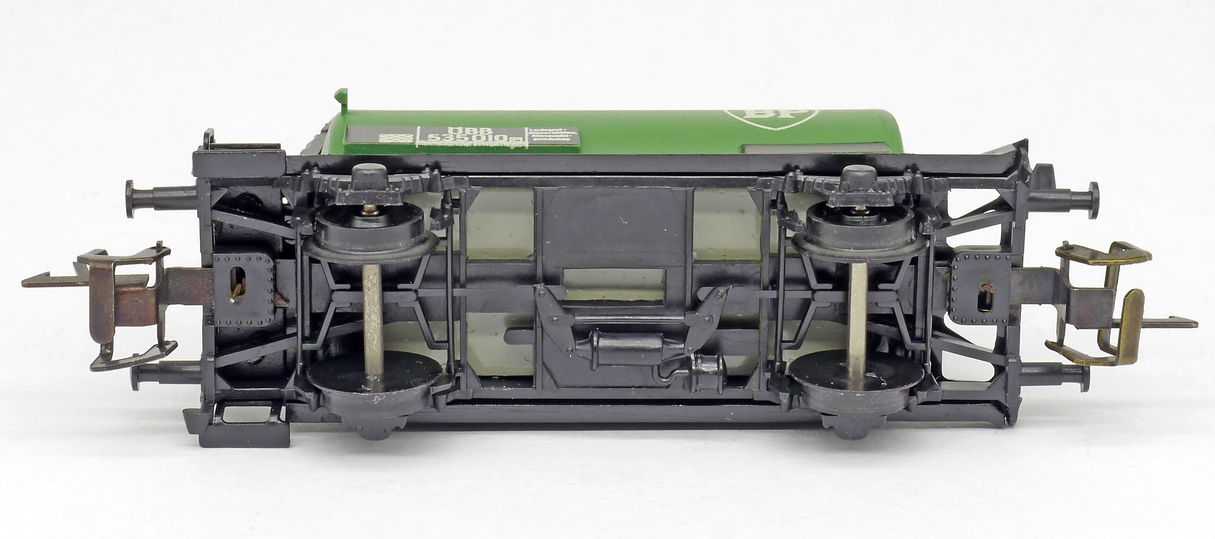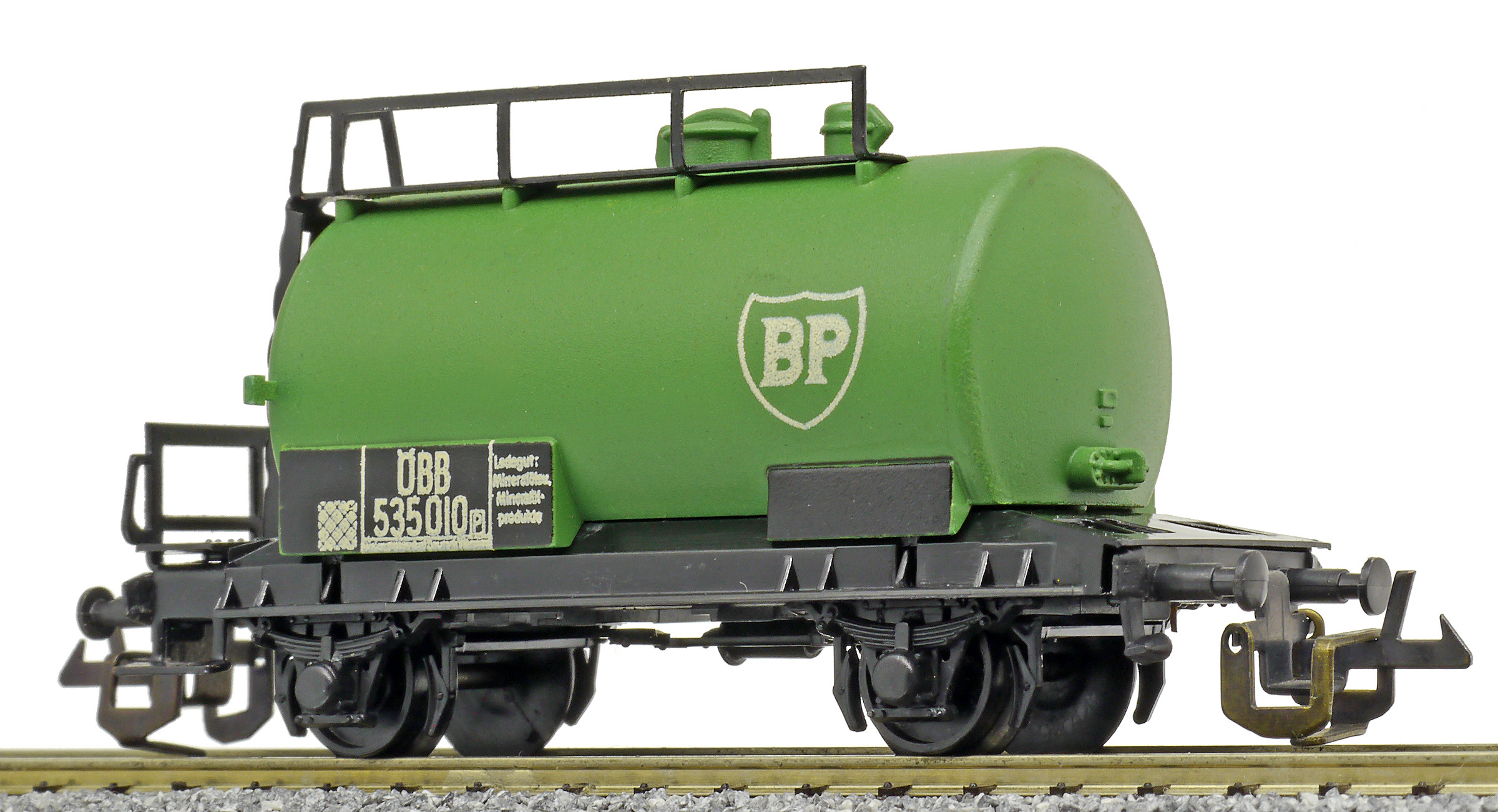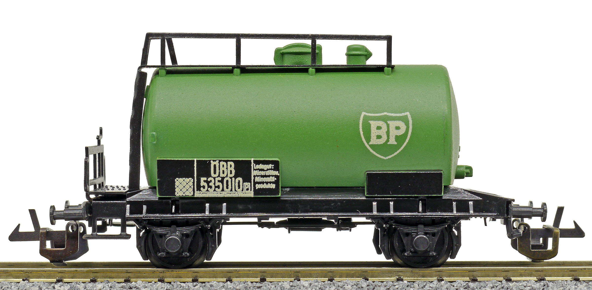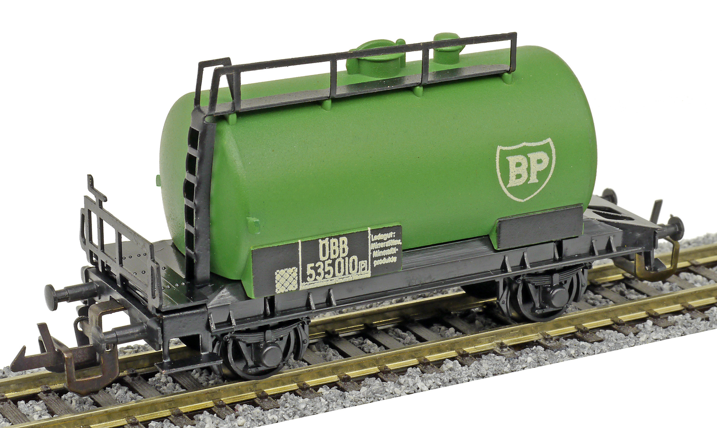 kotlový vůz zelený s černým pojezdem a s logem „BP“