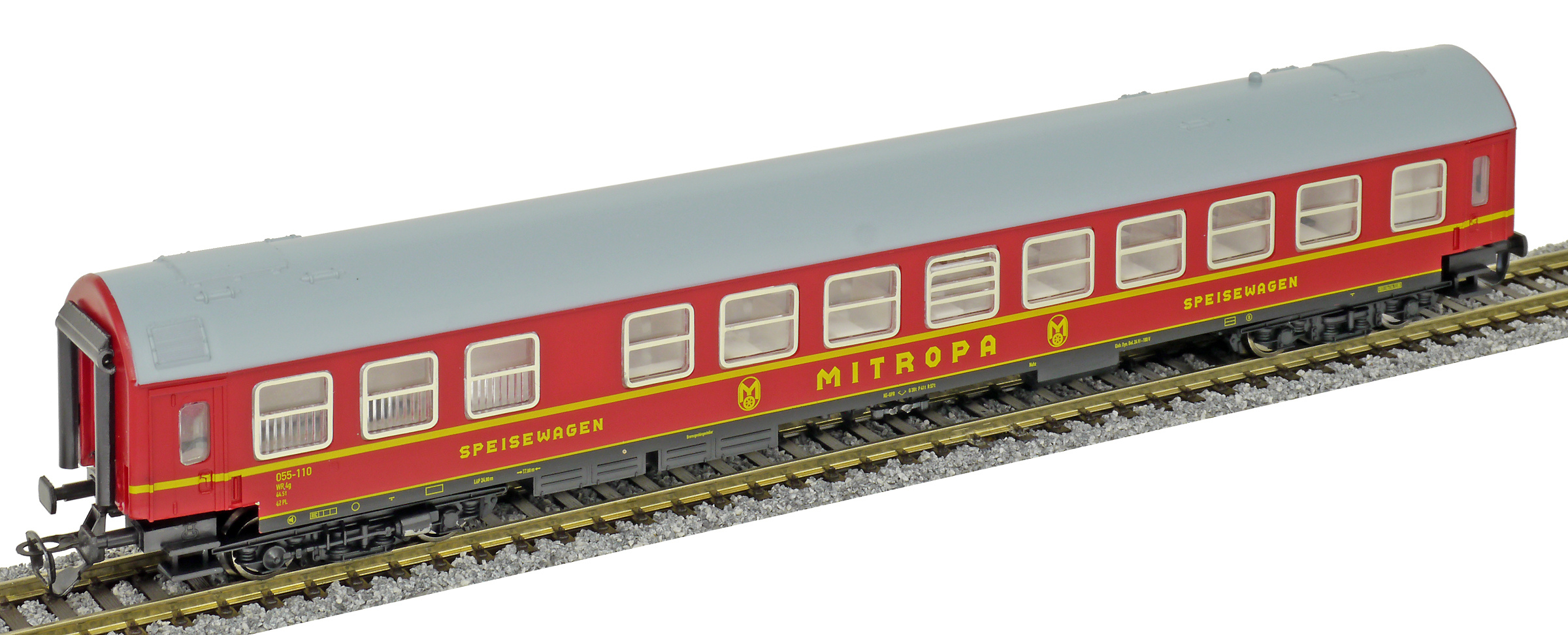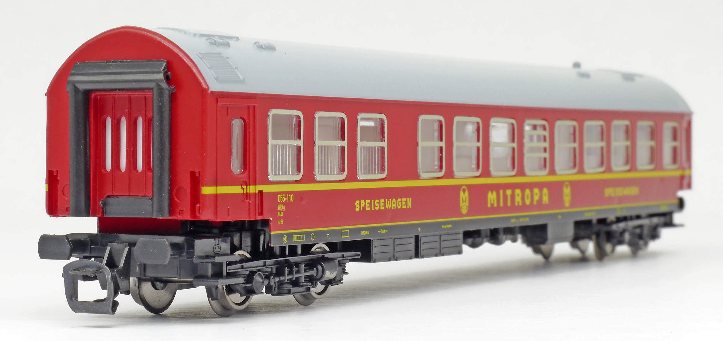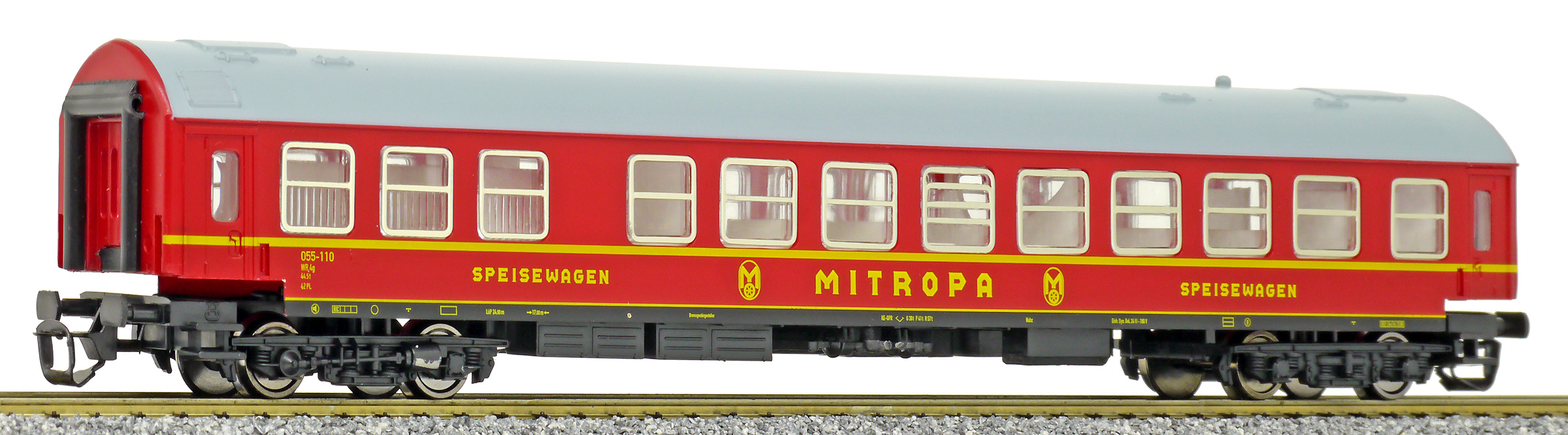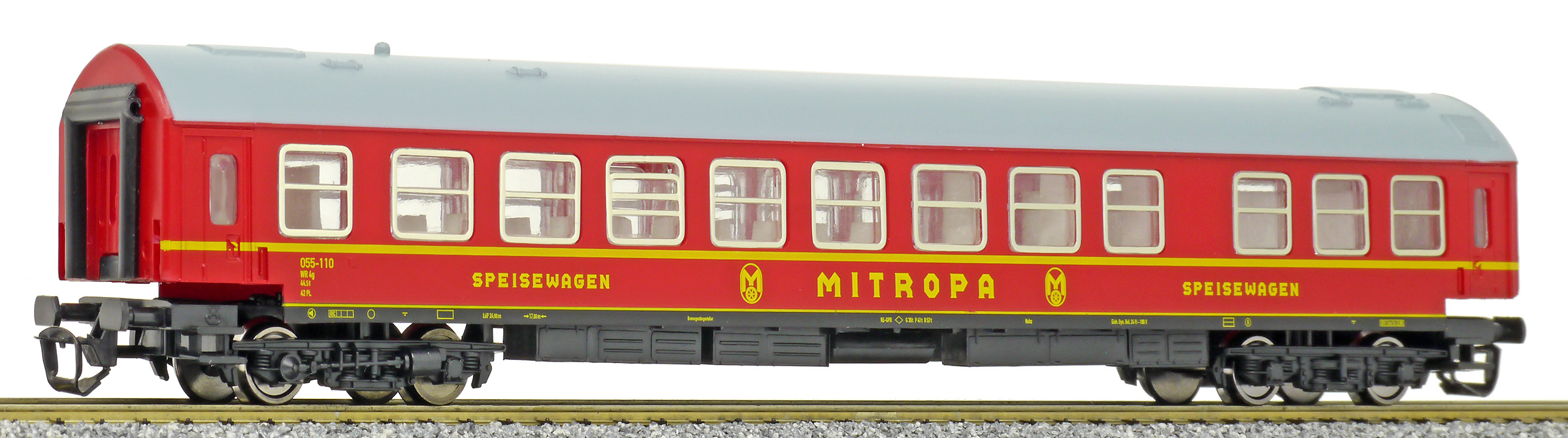 | jídelní vůz červený s šedou střechou „MITROPA“ |