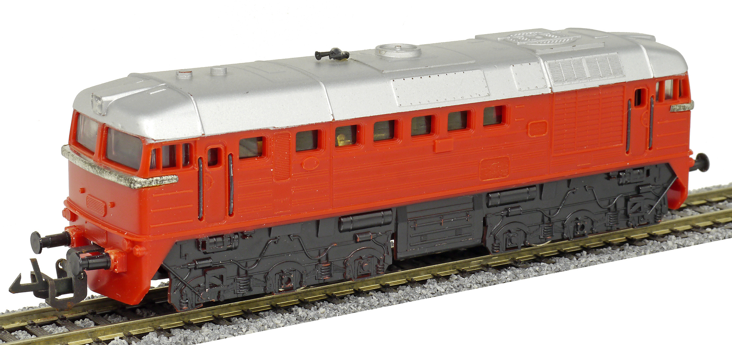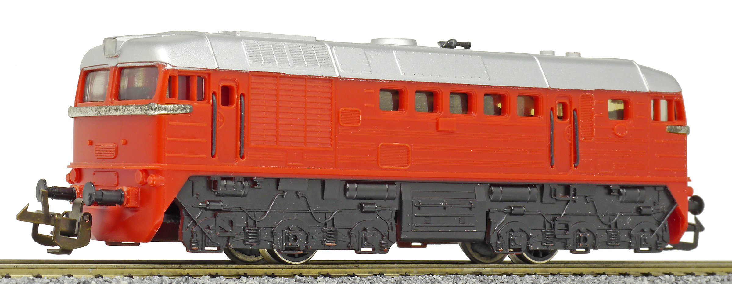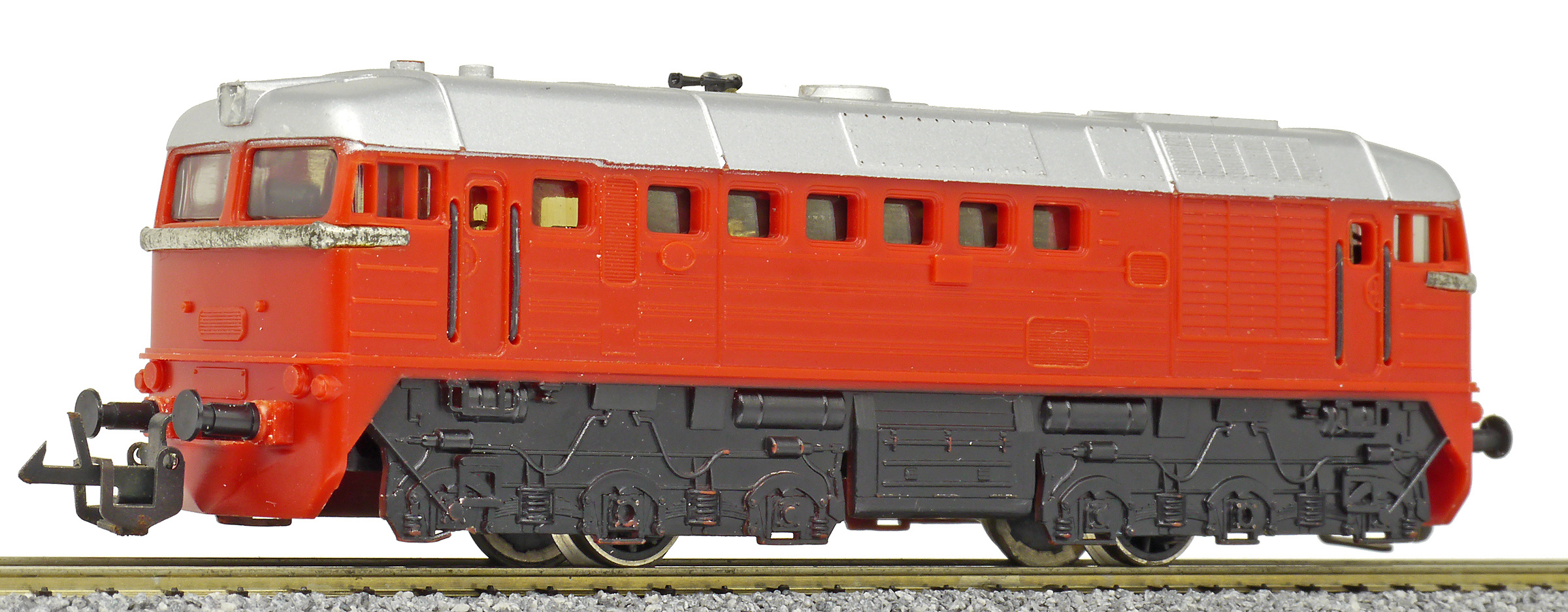 | dieselová lokomotiva červená v barvě plastu, stříbrná střecha a černá imitace pojezdu |