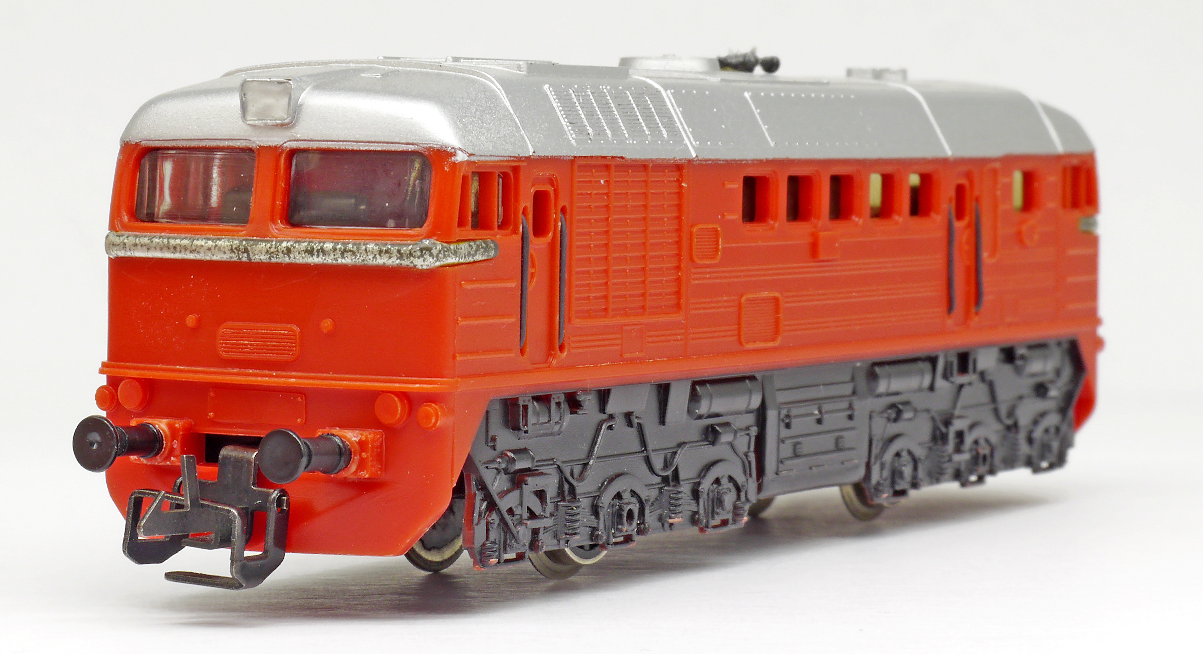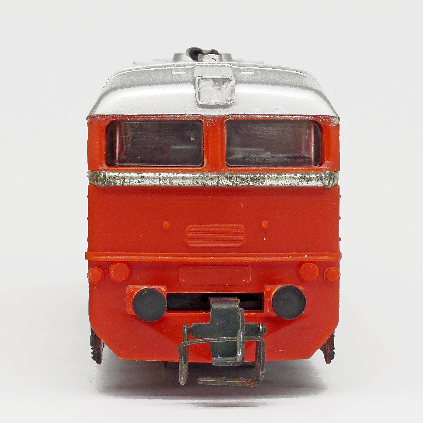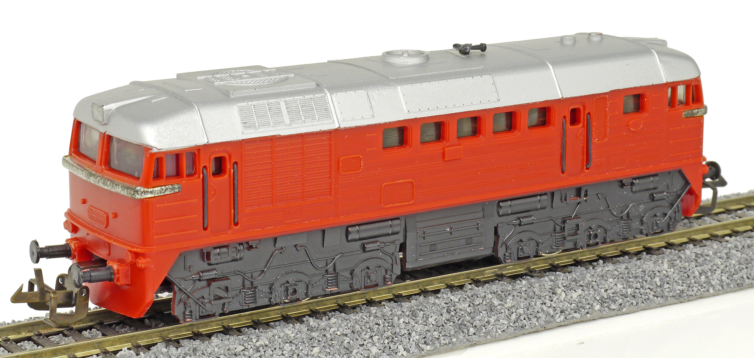 | dieselová lokomotiva červená v barvě plastu, stříbrná střecha a černá imitace pojezdu |