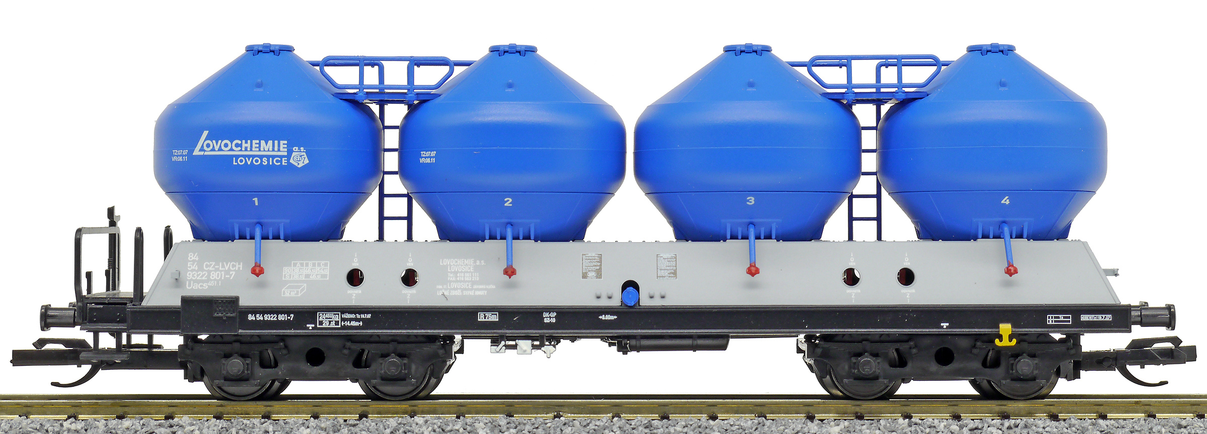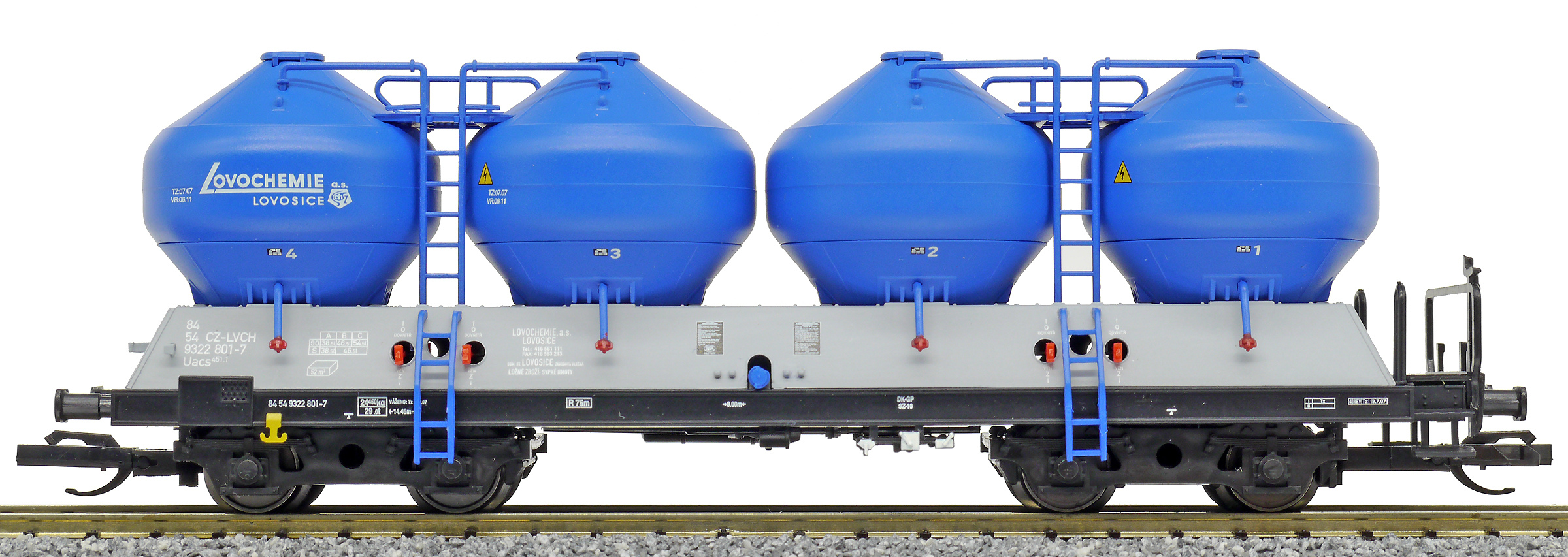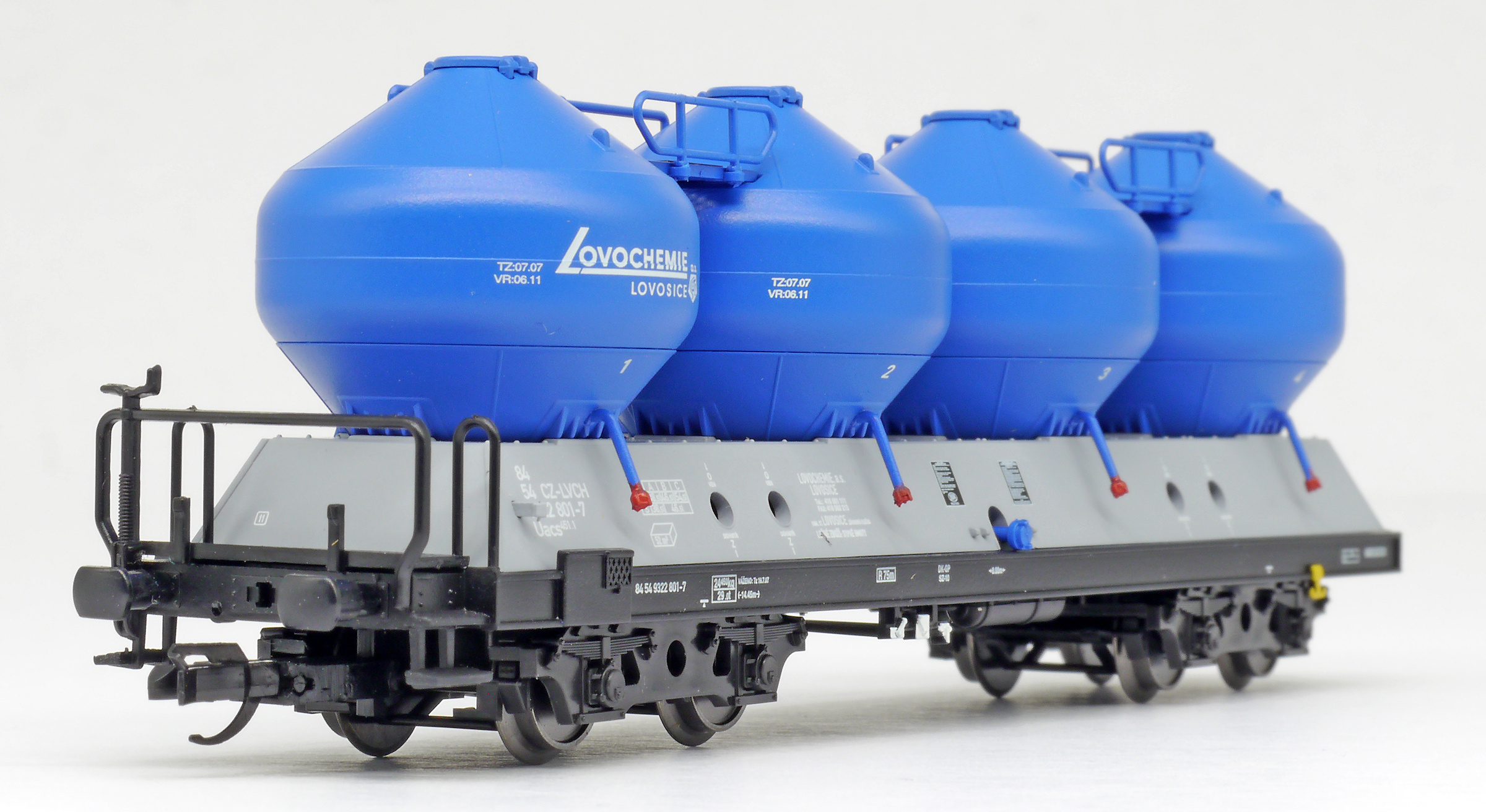| nákladní samovýsypný vůz šedý s modrými nádobami a s logem „Lovochemie“ |