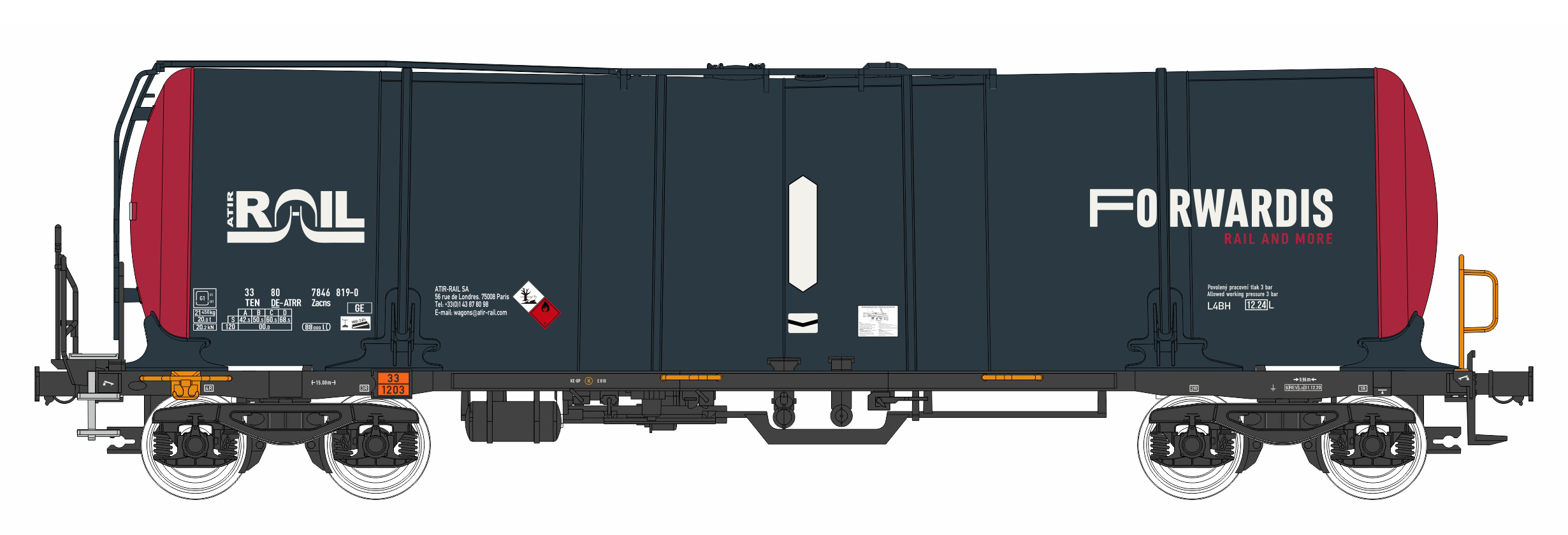 | kotlový vůz tmavě šedý-vínově červená čela s logy „ATIR-RAIL“ a „FORWARDIS“ |