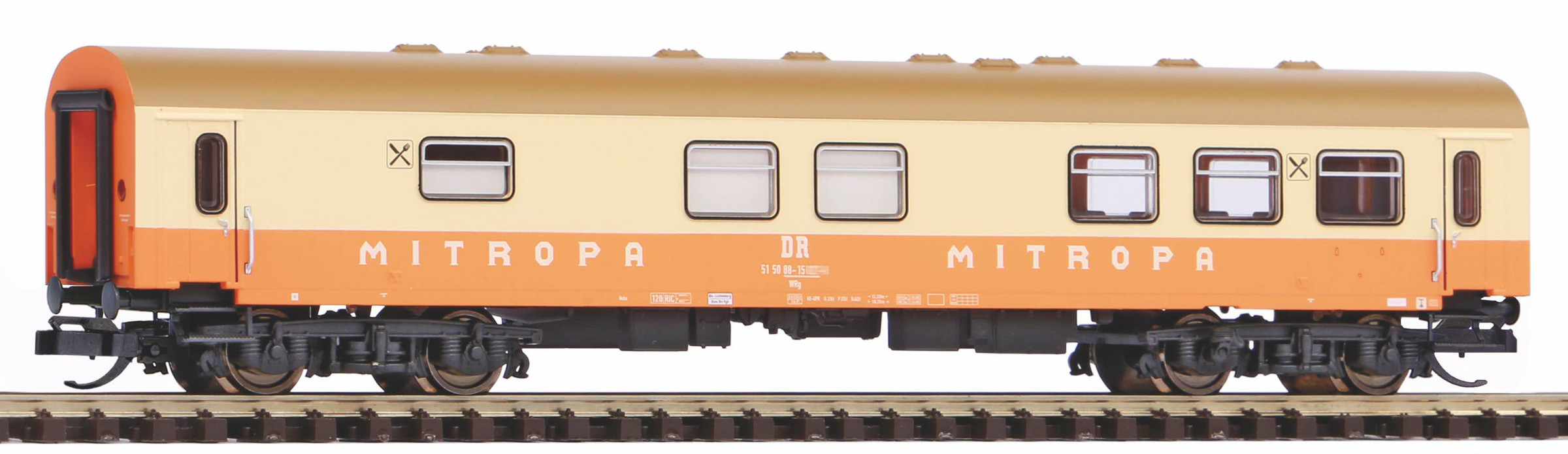 | rekonstruovaný jídelní vůz oranžový-slonová kost s olivovou střechou „Mitropa“ |