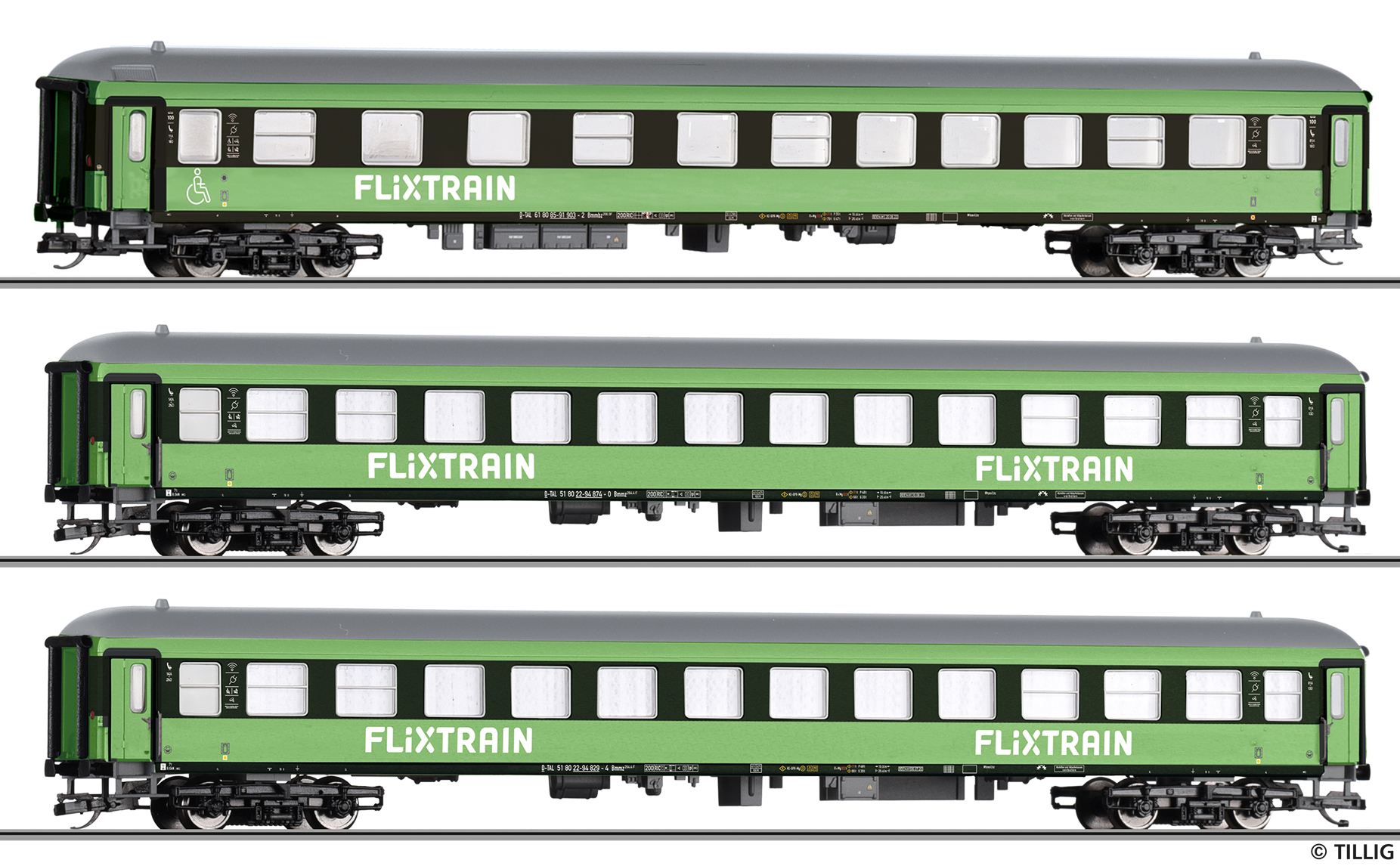 | set tří rychlíkových vozů v barevném schematu „Flixtrain“, SET 1 |