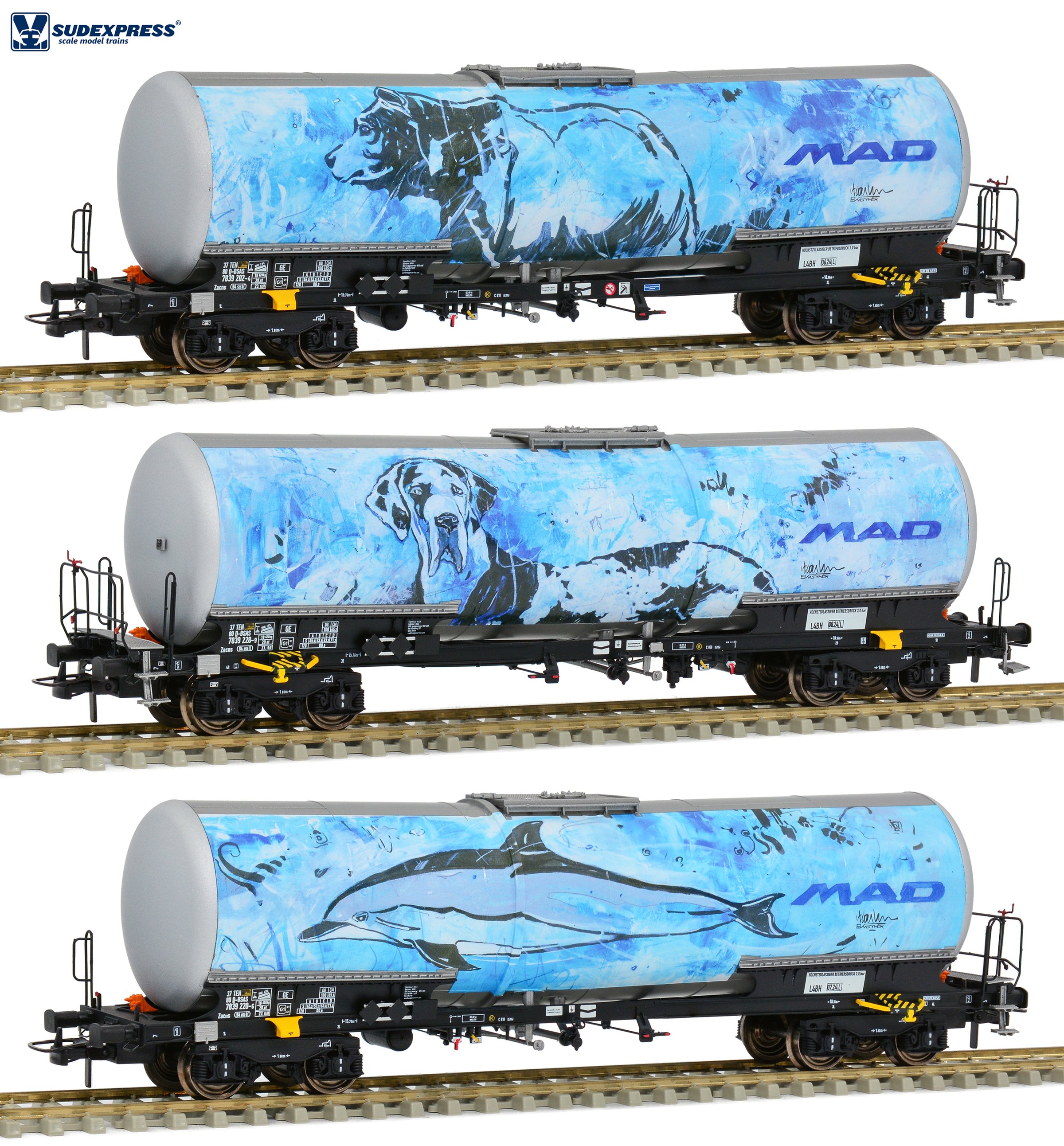 set tří šedých kotlových vozů s potiskem motivů zvířat