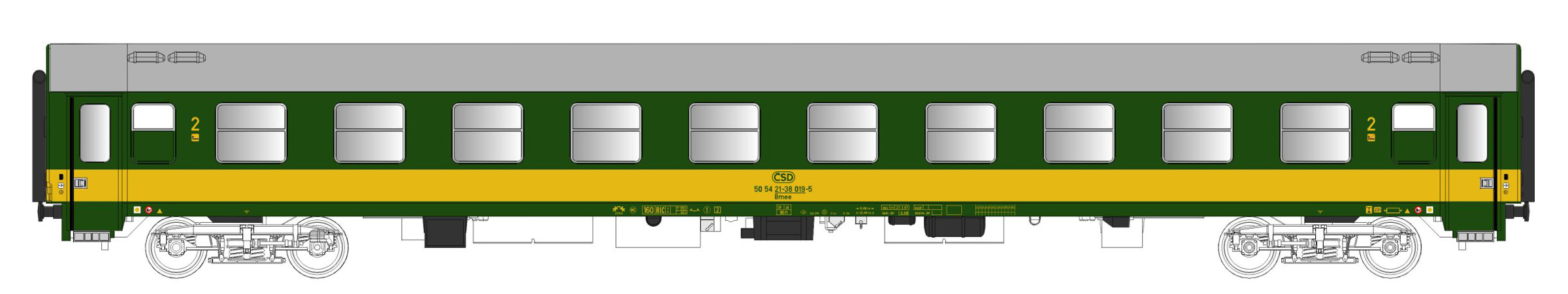 | rychlíkový vůz zelený se žlutým pruhem a šedou střechou se zavazadlovým oddílem 2. tř. |