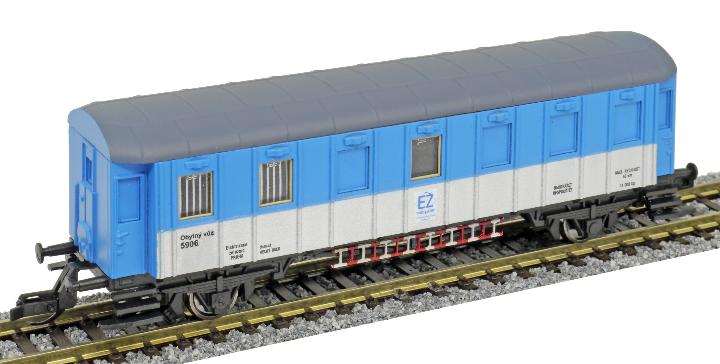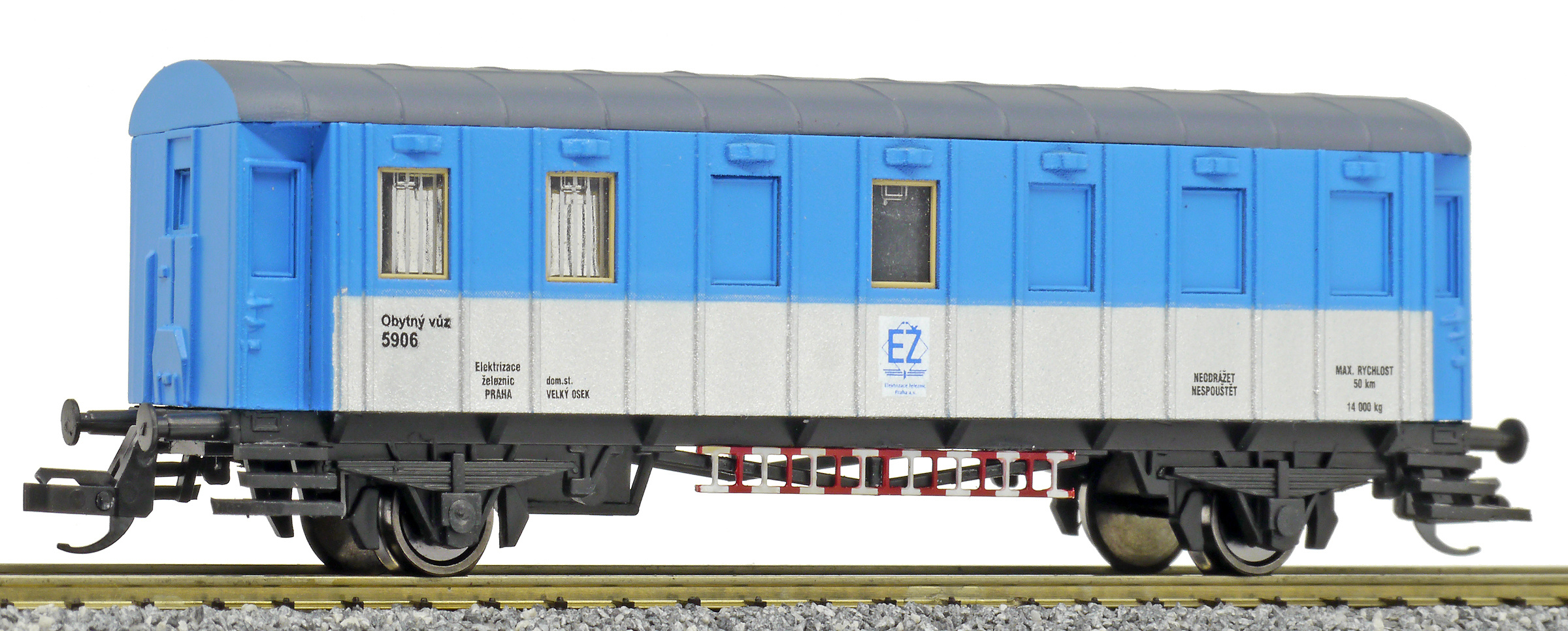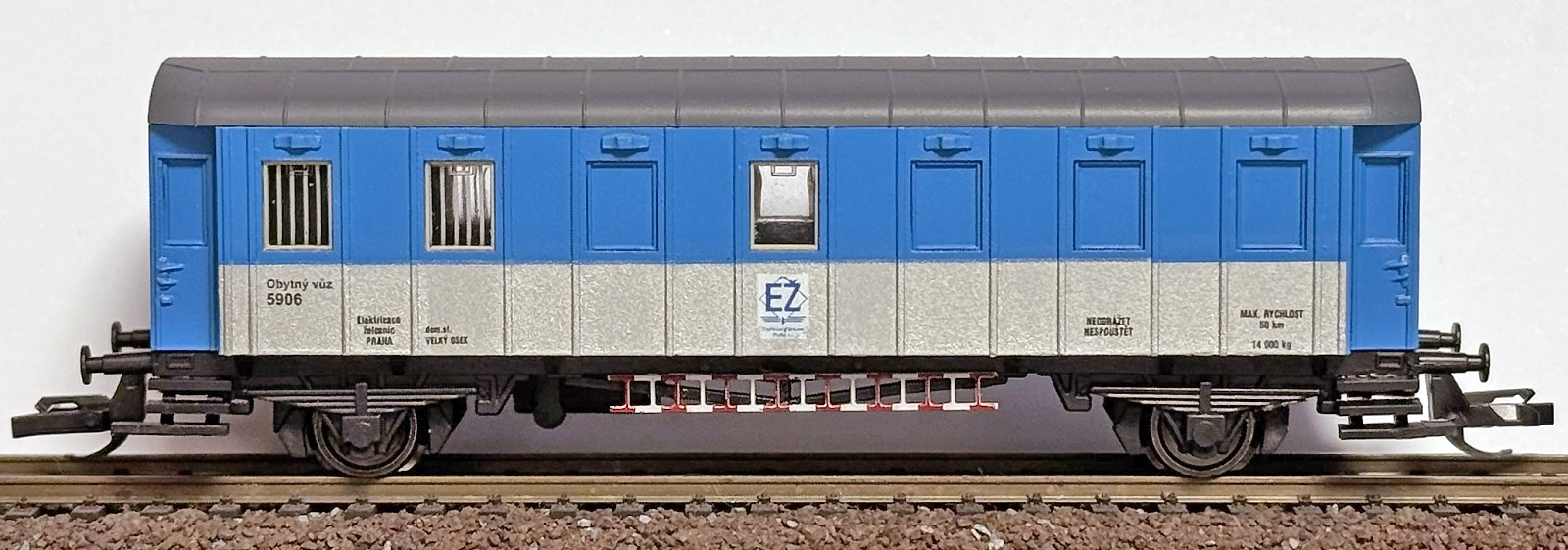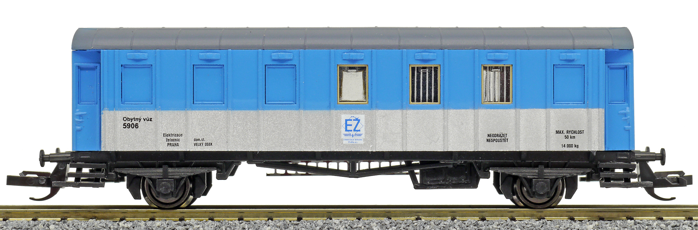| obytný vůz modrý-stříbrný s šedou střechou „Elektrizace železnic“ |