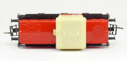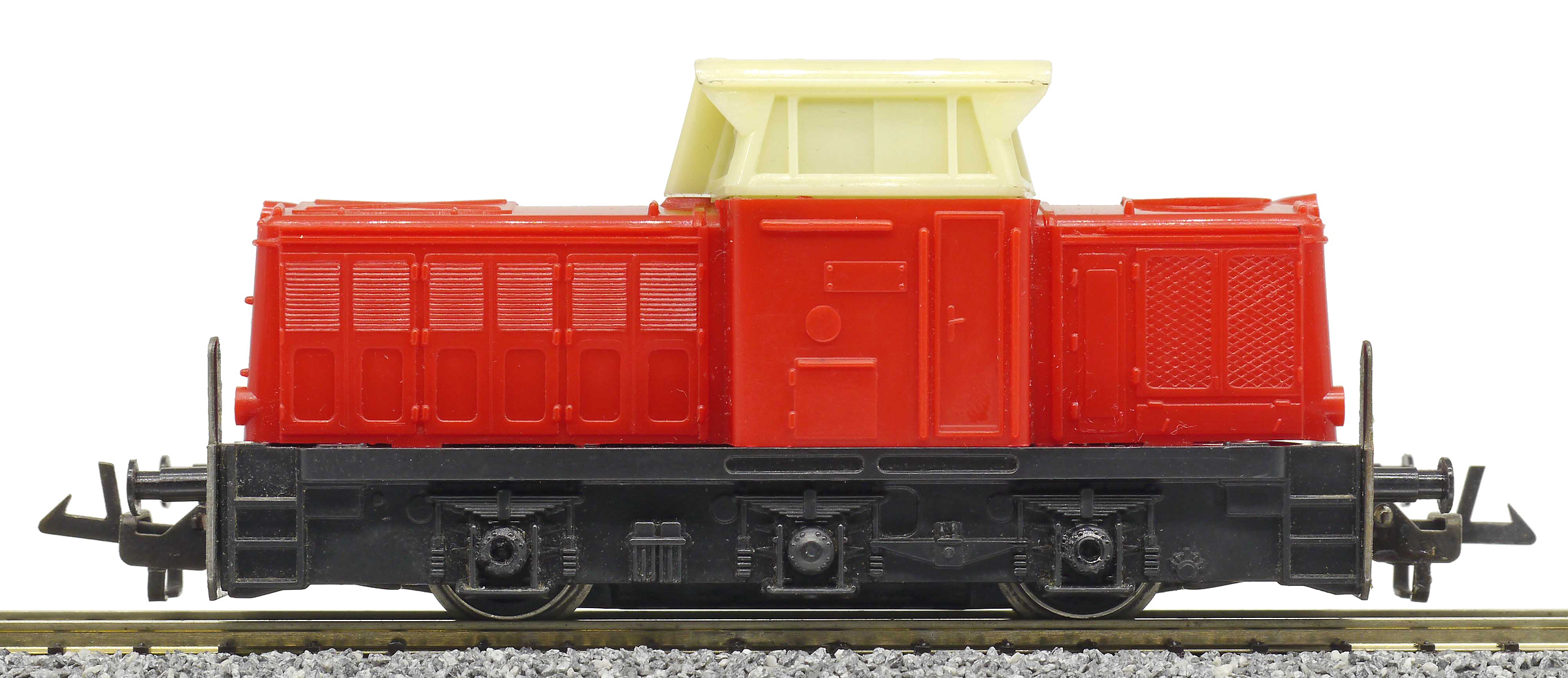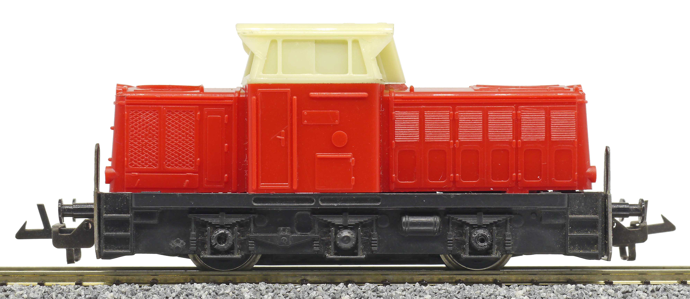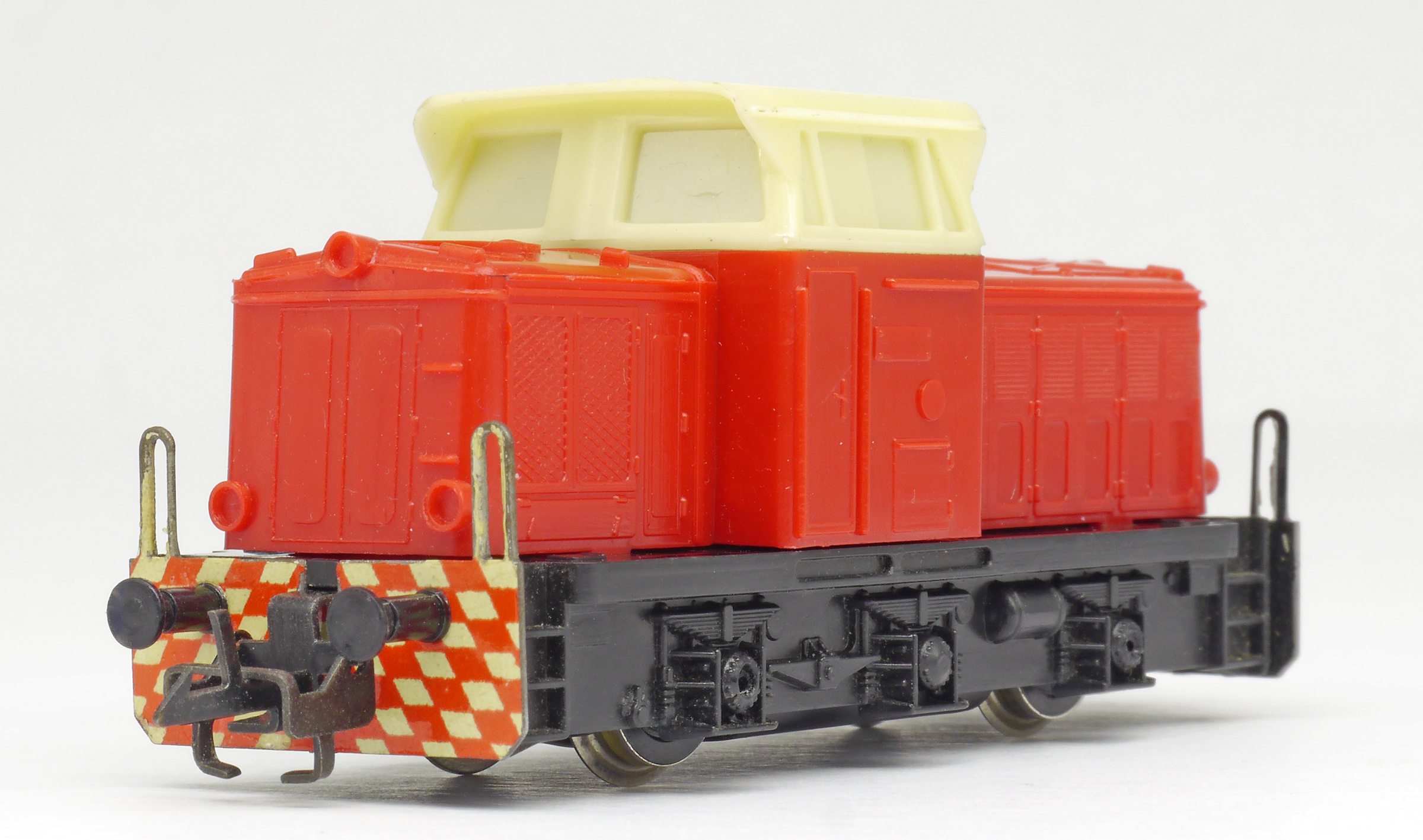 | dieselová lokomotiva v barvě plastu červená s černým pojezdem |