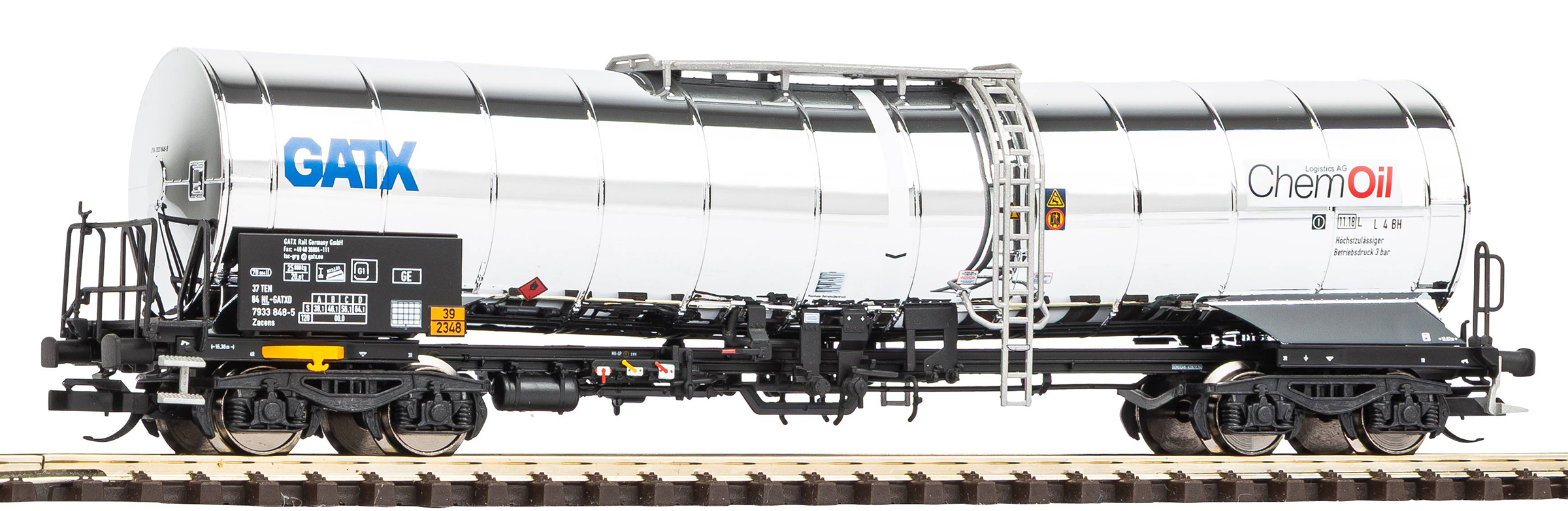 | kotlový vůz stříbrný na přepravu chemikálií s logem „GATX“ a „ChemOil“ |