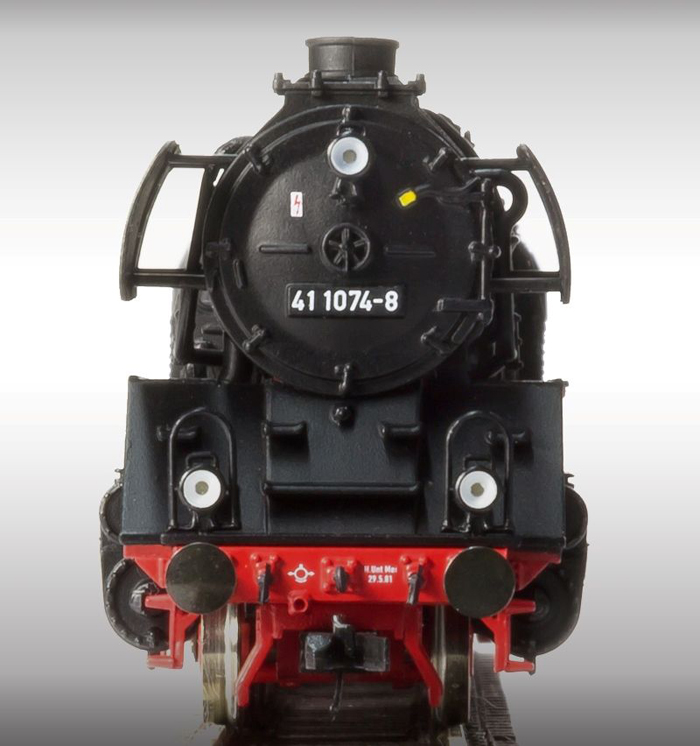 | parní lokomotiva černá s červeným pojezdem a kouřovými plechy BR 41 Reko |