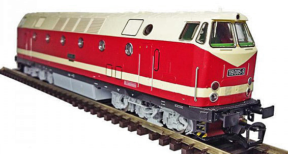 Kód   02555  [Lokomotivy] → [Motorové] → [BR 119] → 02555: dieselová lokomotiva červená-krémová s šedým pojezdem