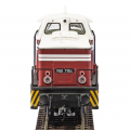 | dieselová lokomotiva červená-bílá s dvojitým pruhem a s černým rámem, červená kola |
