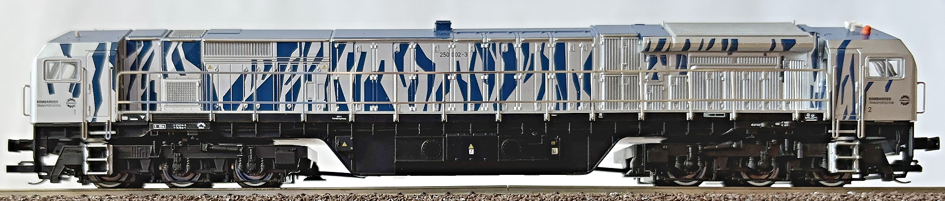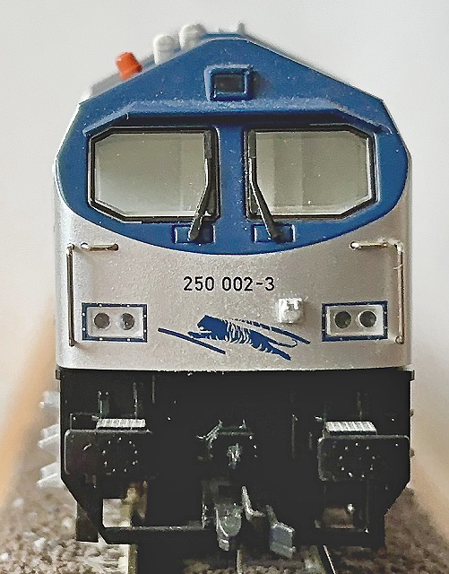 dieselová lokomotiva stříbrná-modrá s černým pojezdem