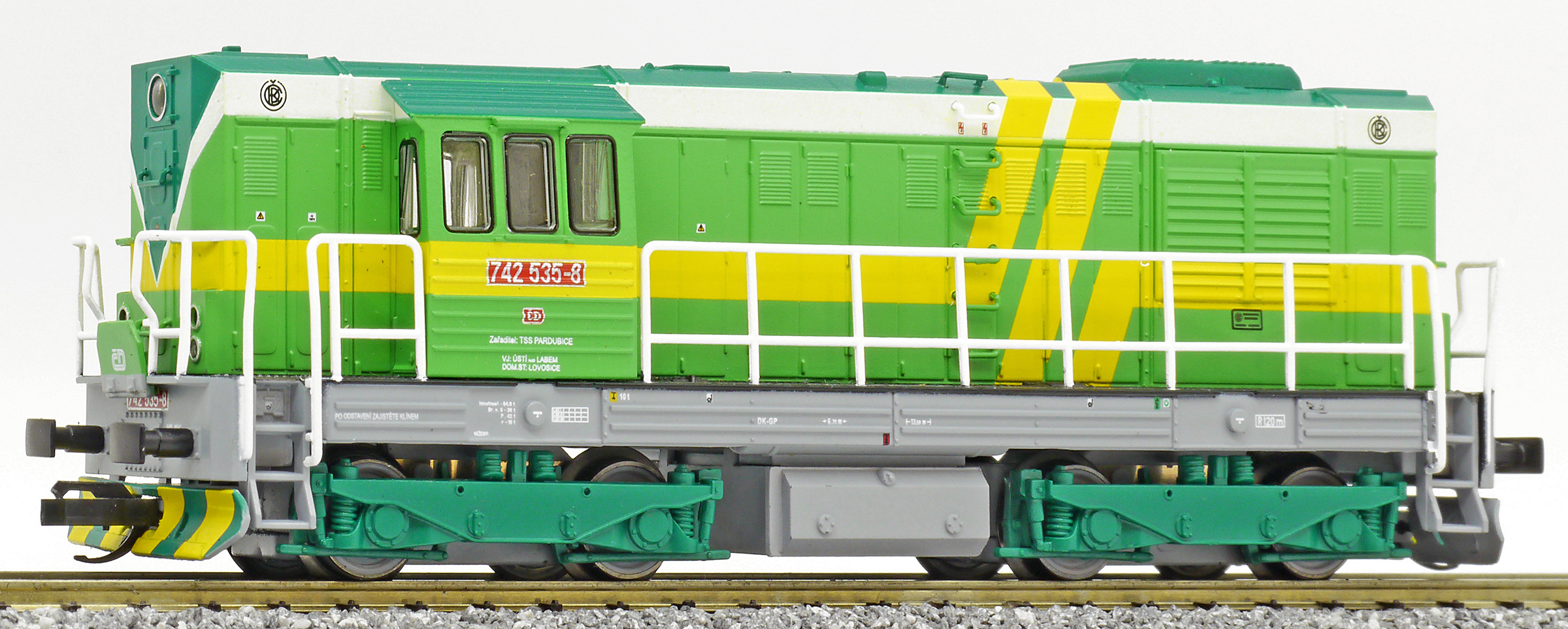 Popis   dieselová lokomotiva v zeleném provedení se žlutými proužky, šedý rám