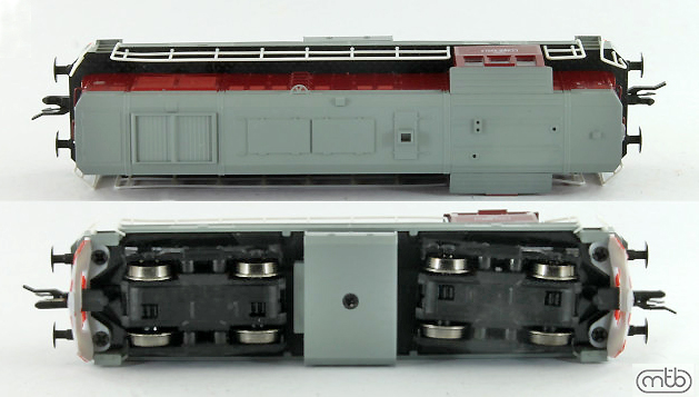 Popis   dieselová lokomotiva červená s šedou střechou, rámem a pojezdem