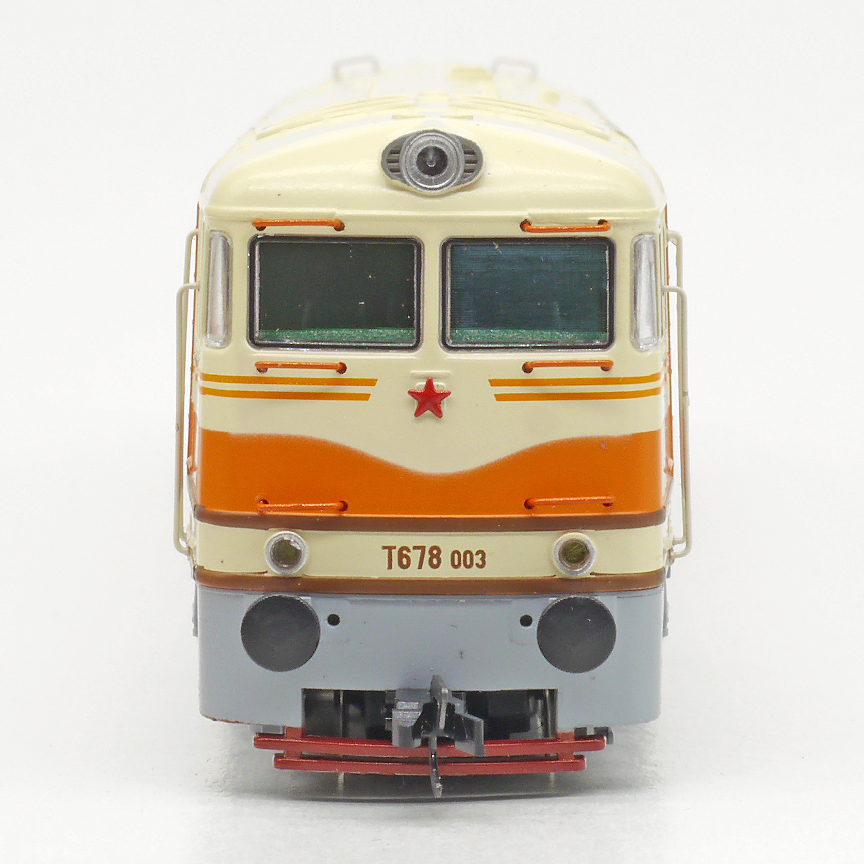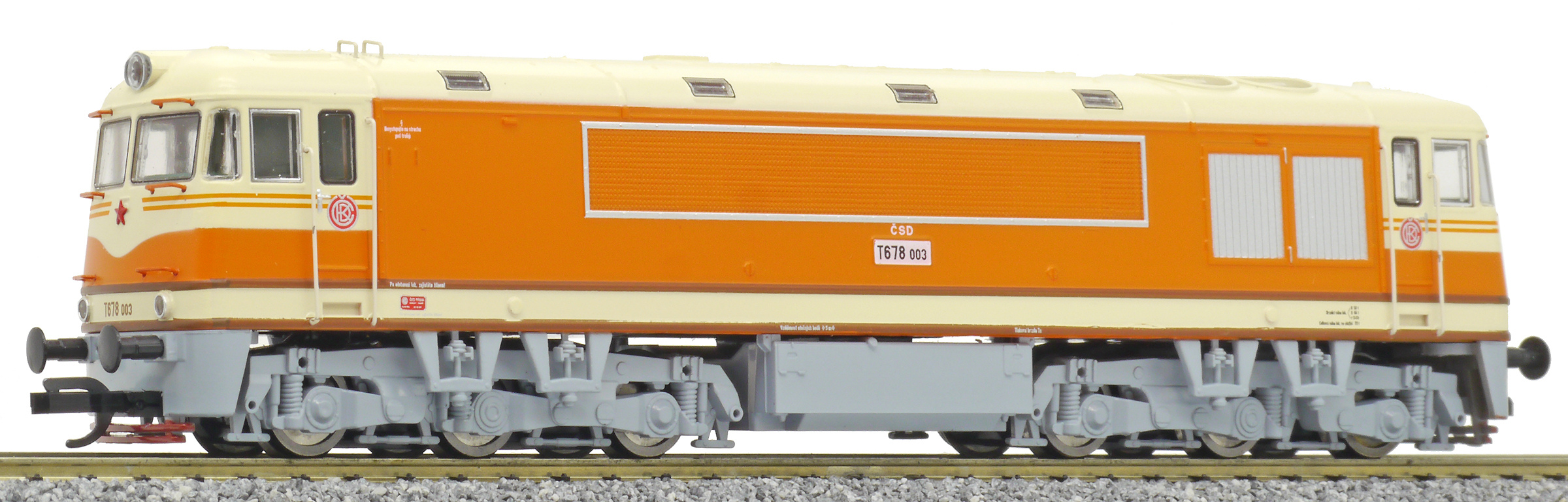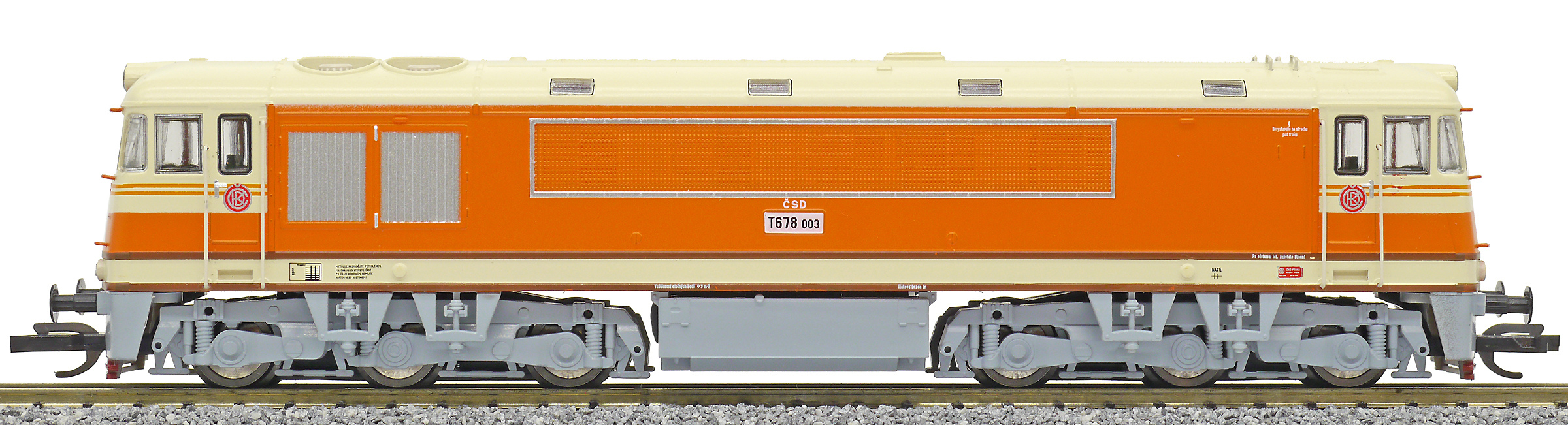 | dieselová lokomotiva oranžová-slonová kost, šedý pojezd |