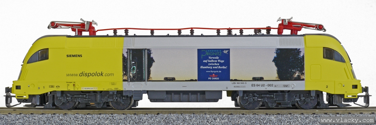 Popis   elektricKá lokomotiva žlutá s reklamou PEG (Prignitzer Eisenbahn GmbH)