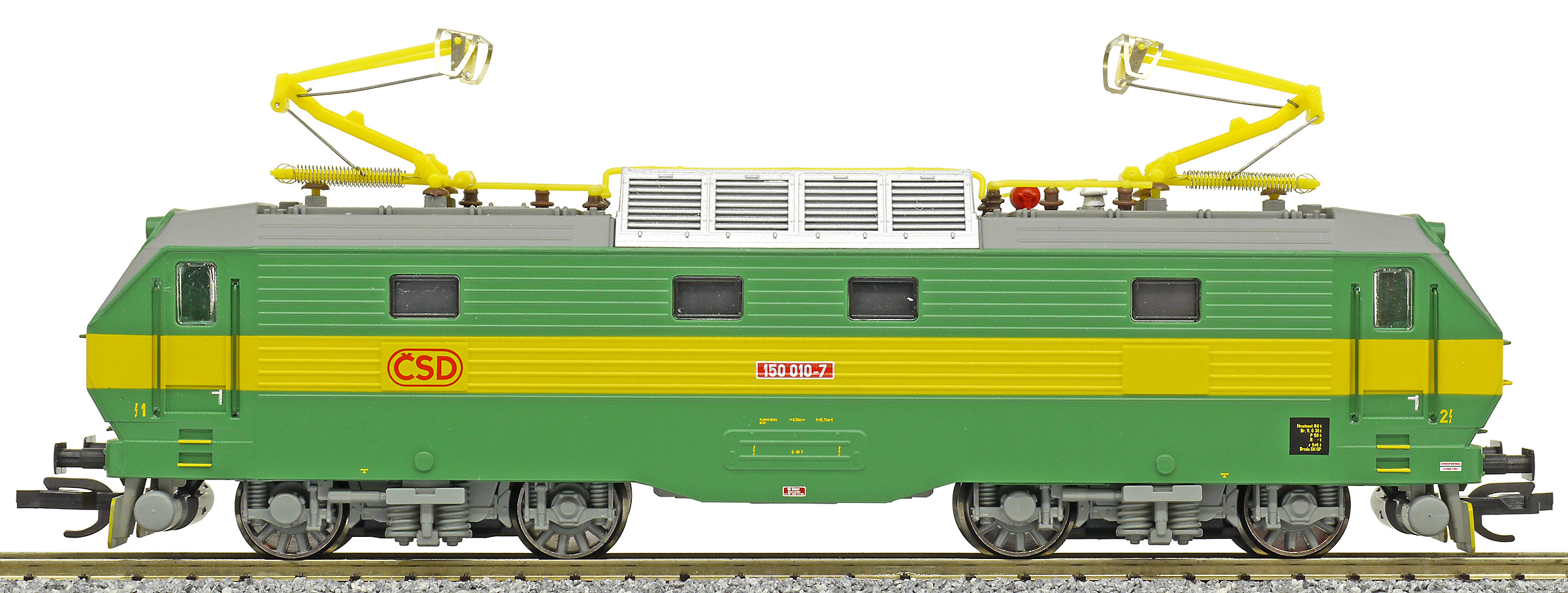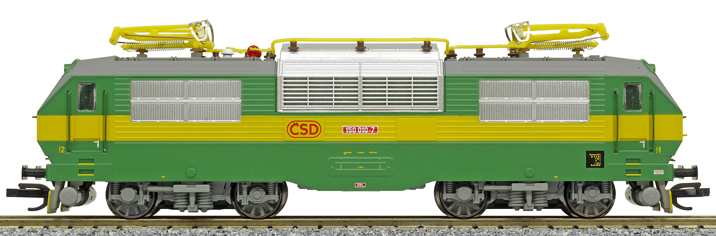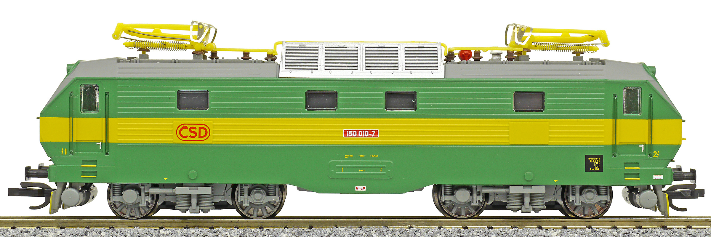| elektrická lokomotiva zelená se žlutým výstražným pruhem |