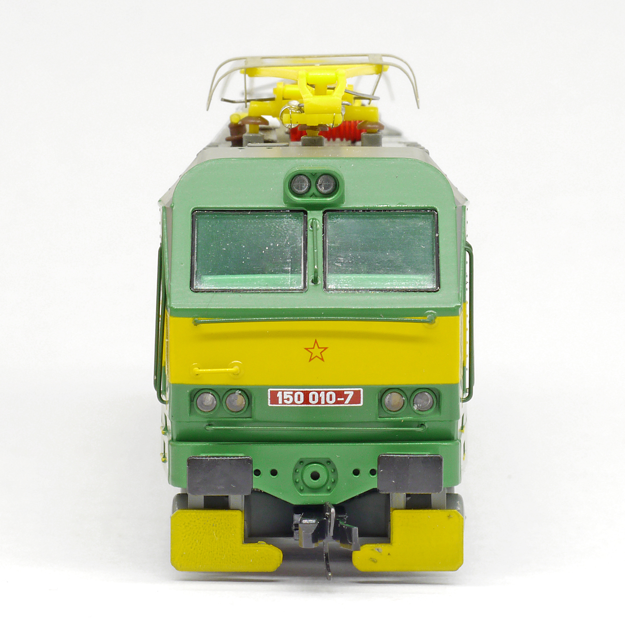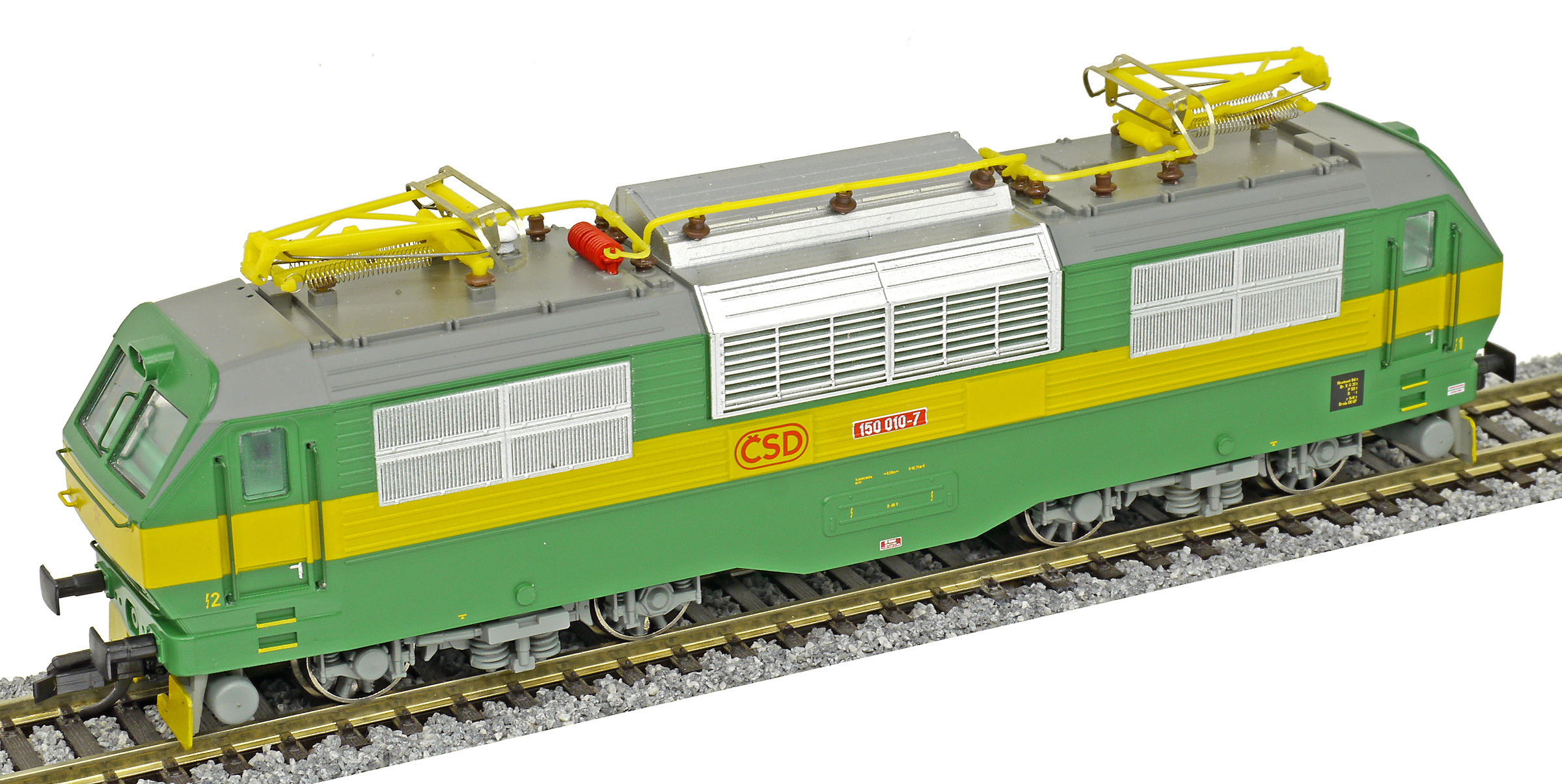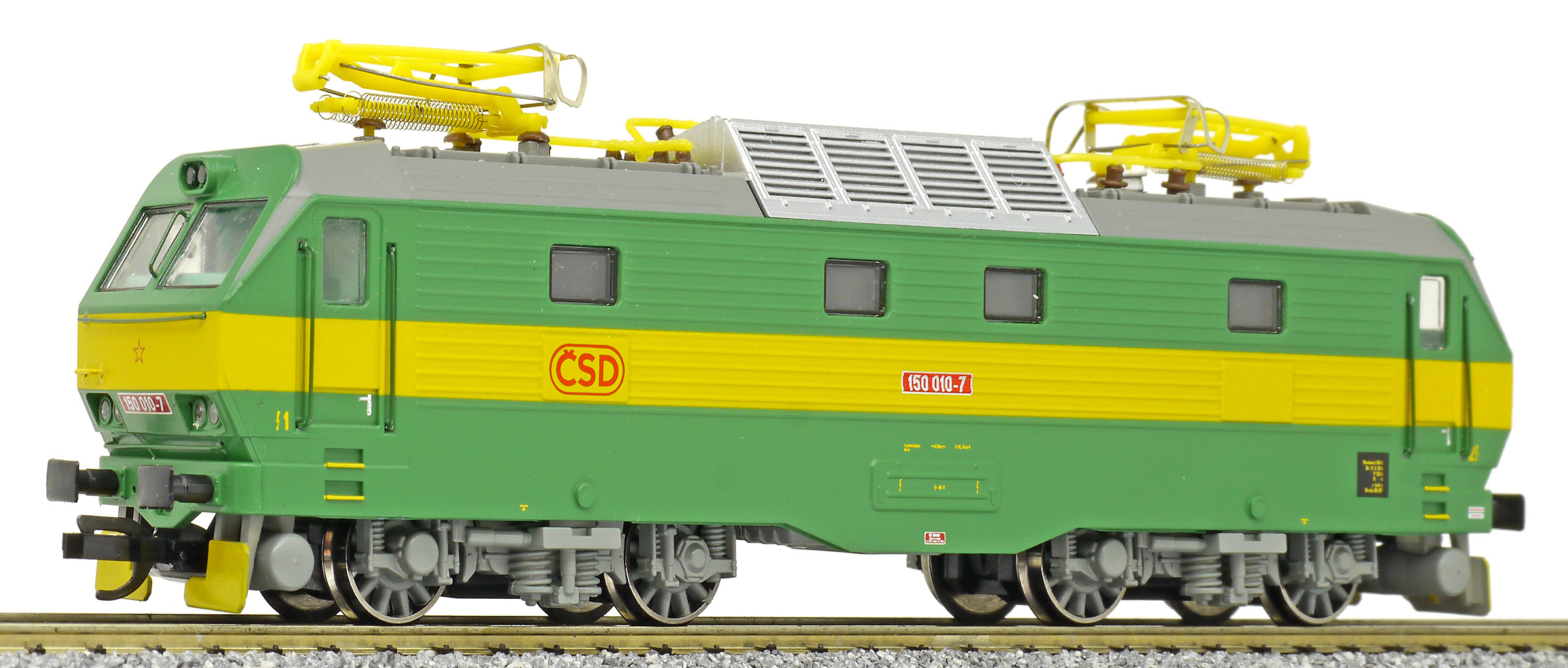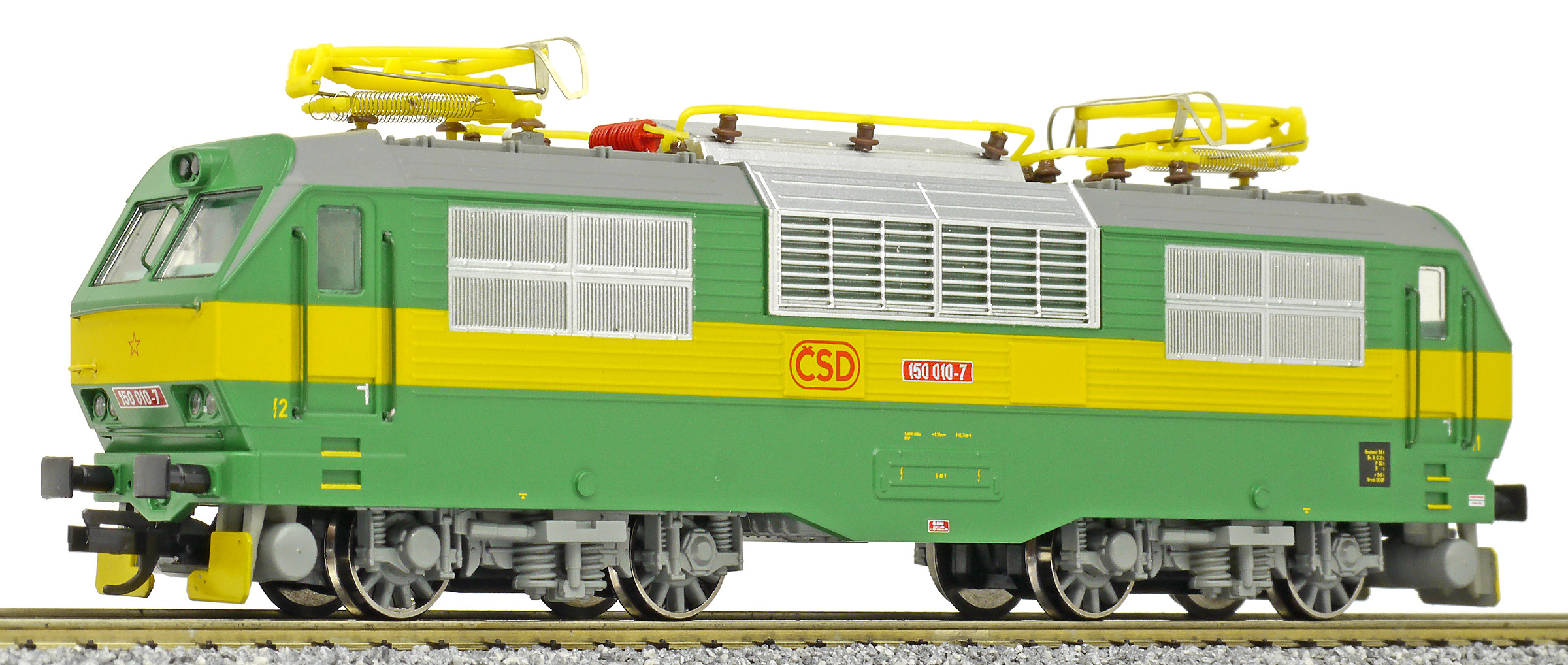 | elektrická lokomotiva zelená se žlutým výstražným pruhem |