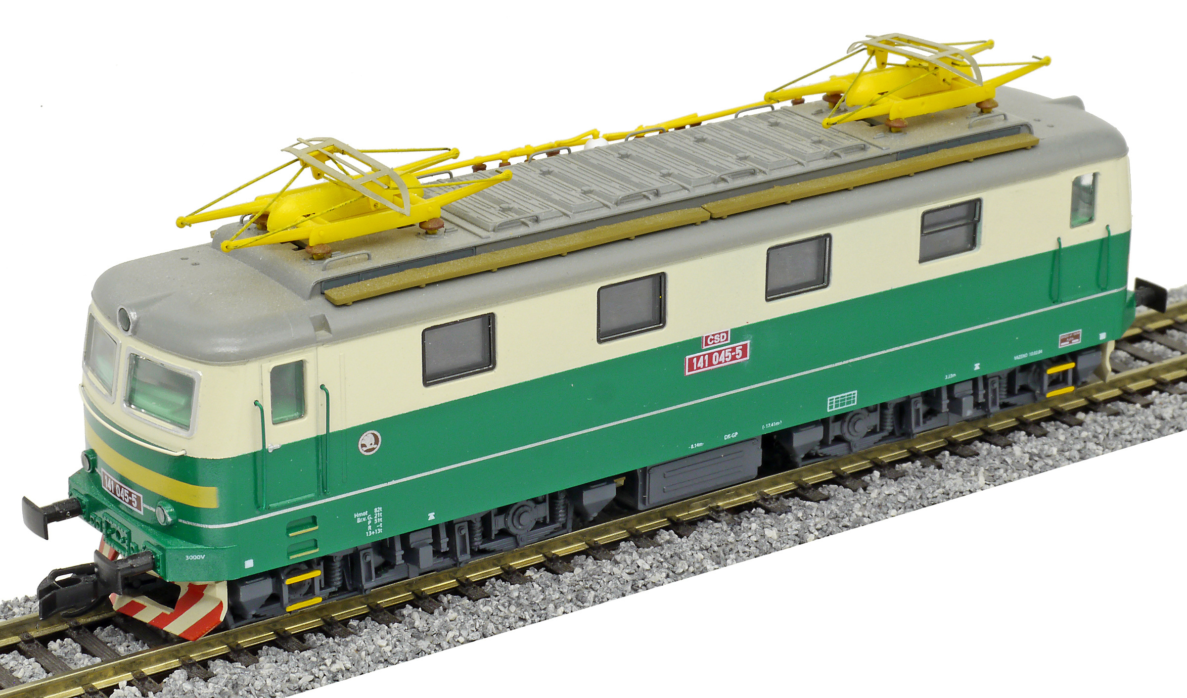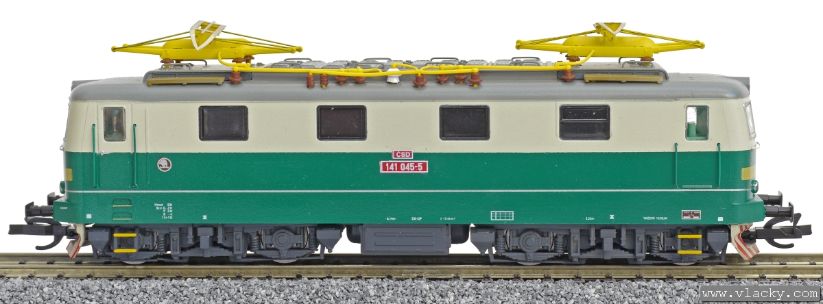 Kód   CD-141-046  [Lokomotivy] → [Elektrické] → [E499.1/E469.1] → CD-141-046: elektrická lokomotiva zelená-slonová kost, šedá střecha, oranžový výstražný pruh