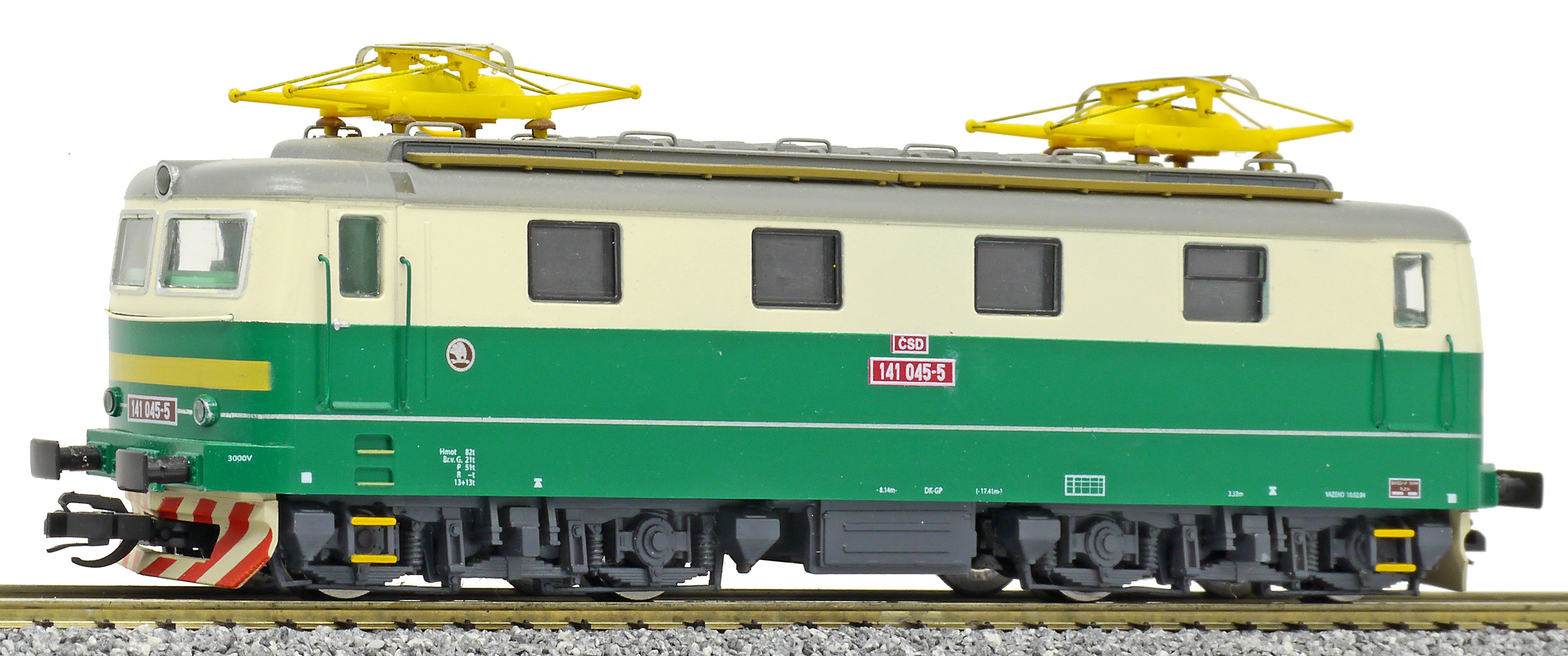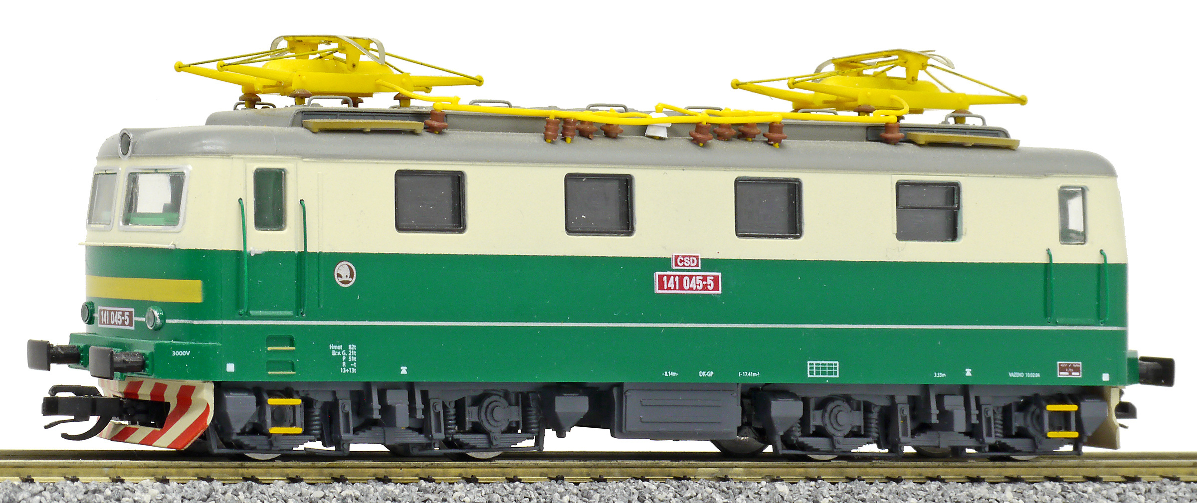 Popis   elektrická lokomotiva zelená-slonová kost, šedá střecha, žlutý výstražný pruh